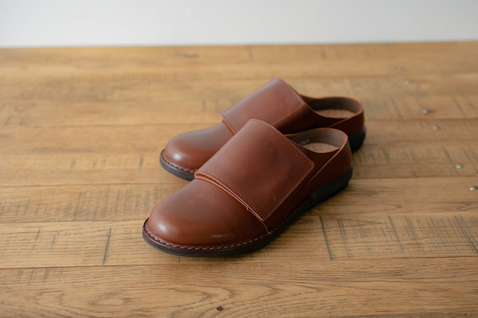 大和時代から使われてきた包装材「経木(ヘギ)」から着想を得た足を包み込むデザイン。新感覚な革靴×甲バンドの組合わせの面白さも魅力。ゆるりとした暮らしになじむクロッグスタイルの一足です。