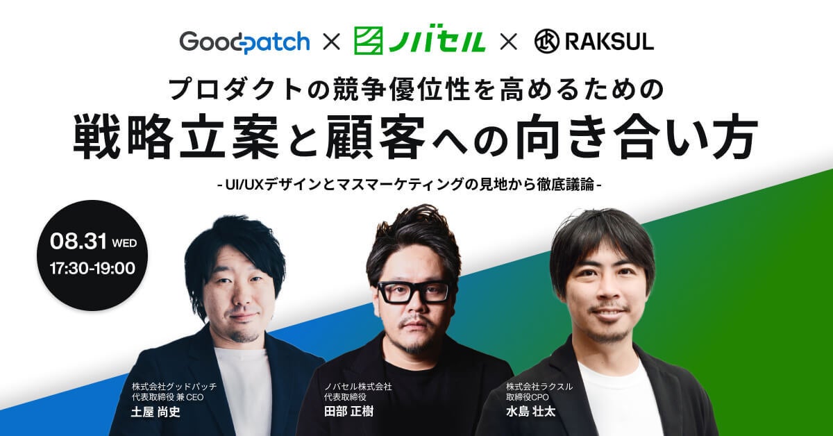 グッドパッチとノバセルのトップが徹底議論!「プロダクトの競争優位性を高めるための戦略立案と顧客への向き合い方」無料オンラインセミナー開催