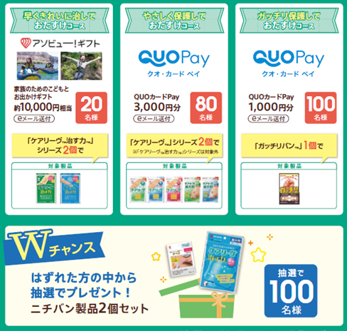 賞品 | <早くきれいに治して おたすけコース> 「ケアリーヴ(TM)治す力(TM)」シリーズ バーコード2個 アソビュー!ギフト 家族のためのこどもとお出かけギフト約10,000円相当 20名様 <やさしく保護して おたすけコース> 「ケアリーヴ(TM)」シリーズ バーコード2個 QUOカードPay3,000円分 80名様 <ガッチリ保護して おたすけコース> 「ガッチリバン(TM)」 バーコード1個 QUOカードPay1,000円分 100名様 <Wチャンス> はずれた方の中から ニチバン製品2個セット 100名様 |