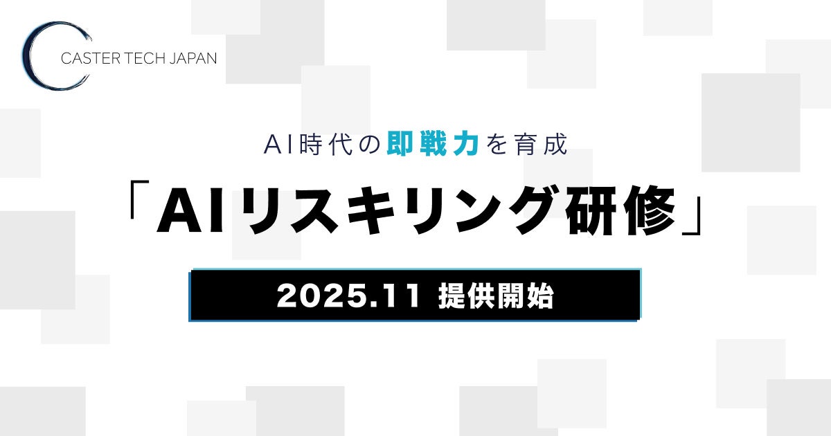 株式会社キャスター(本社:東京都千代田区、代表取締役 中川祥太、以下「キャスター」)のグループ会社である株式会社キャスターテックジャパン(本社:東京都目黒区、代表取締役 披村淳一、以下「CTJ」)は、AIの基礎知識から実務での活用方法・組織への導入やビジネスへの応用までを体系的に学べる「AIリスキリング研修」を2025年11月より提供開始いたしました。