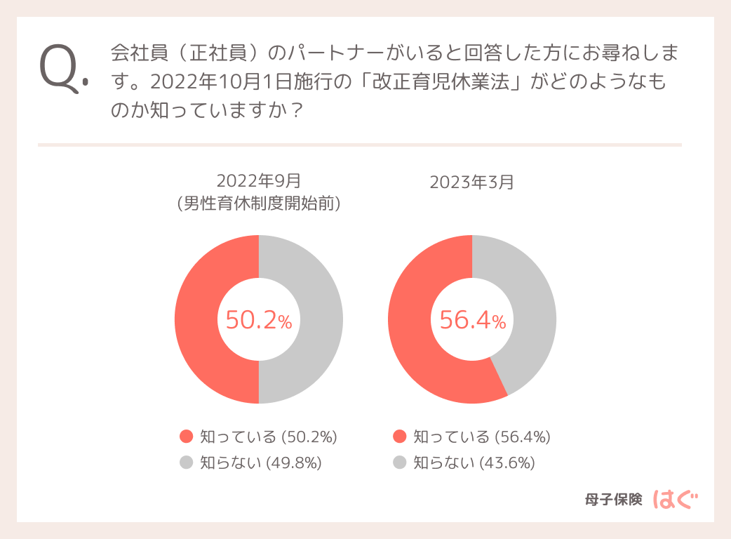 『母子保険はぐ』では、育児休業法(※)が10月に改正される前に、男性育休に関する調査を実施しており、今回は改正から半年が経った今、妊婦さんの認知や意識がどう変わっているのかについても調査しました。