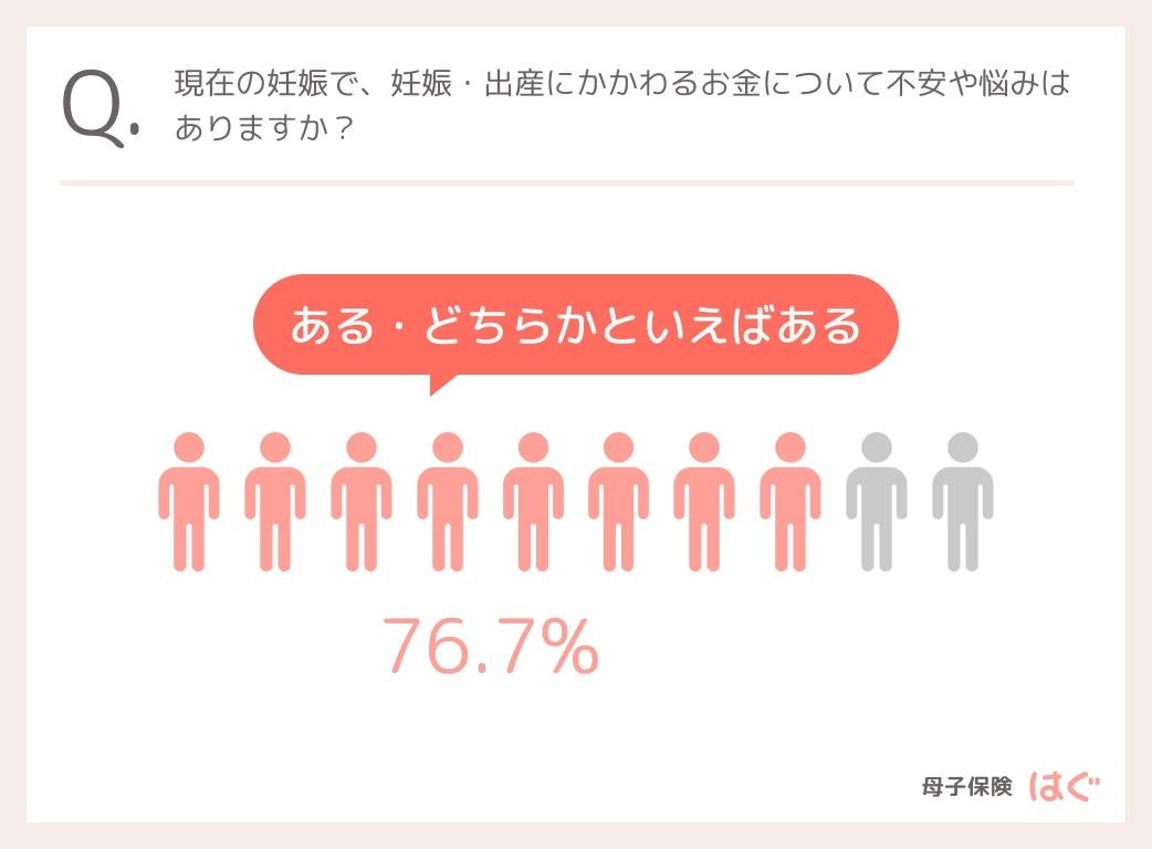- 妊娠、出産に関わるお金について不安や悩みがあると回答したかたは76.7%と多くの方が不安に思っている。