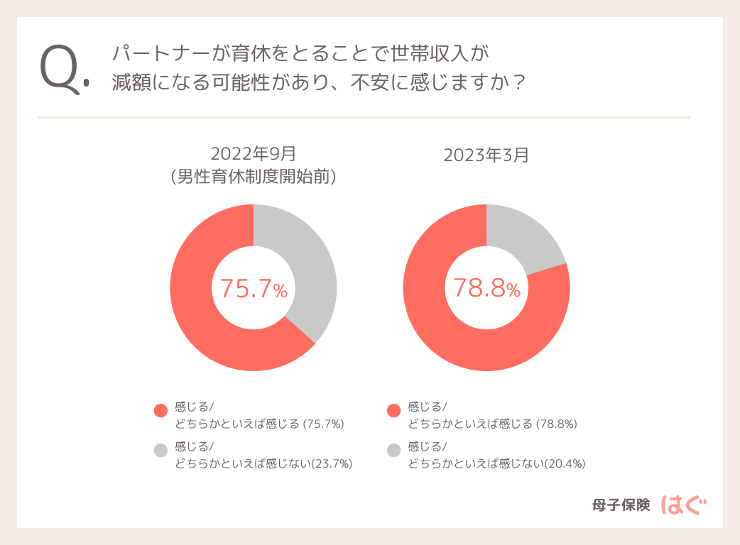 また、パートナーの育休に関して、世帯収入が減額になることに対し、「不安を感じる・どちらかといえば感じる」と回答した方は78.8%と昨年の結果に比べて3.1ポイントアップしていました。