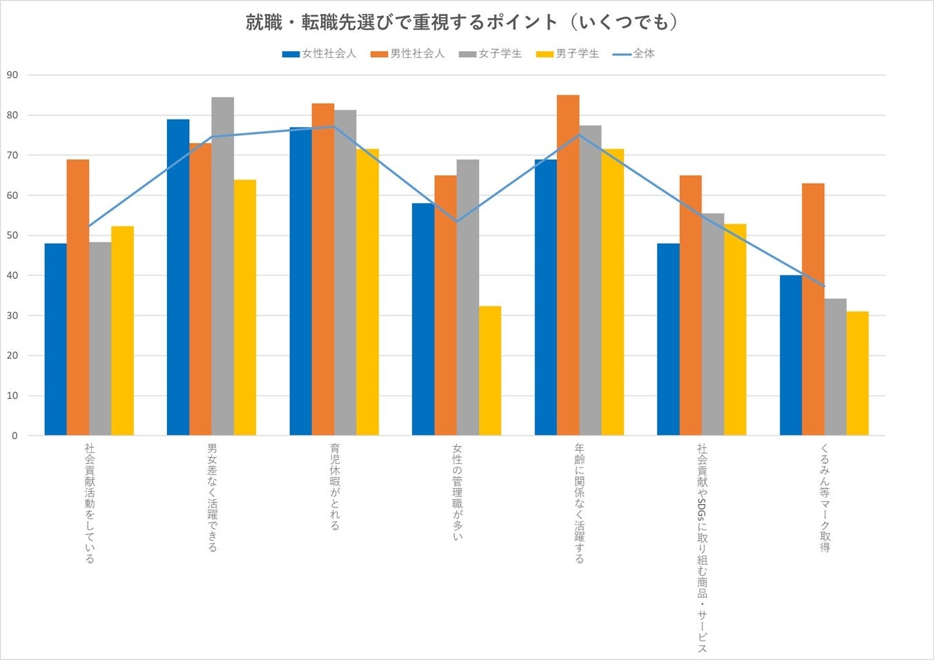 ・ Z世代の70%が、就職・転職先企業が育児休暇が取れる、年齢に関係なく活躍できる、男女差なく活躍できるかどうかを企業選択基準として重視している。