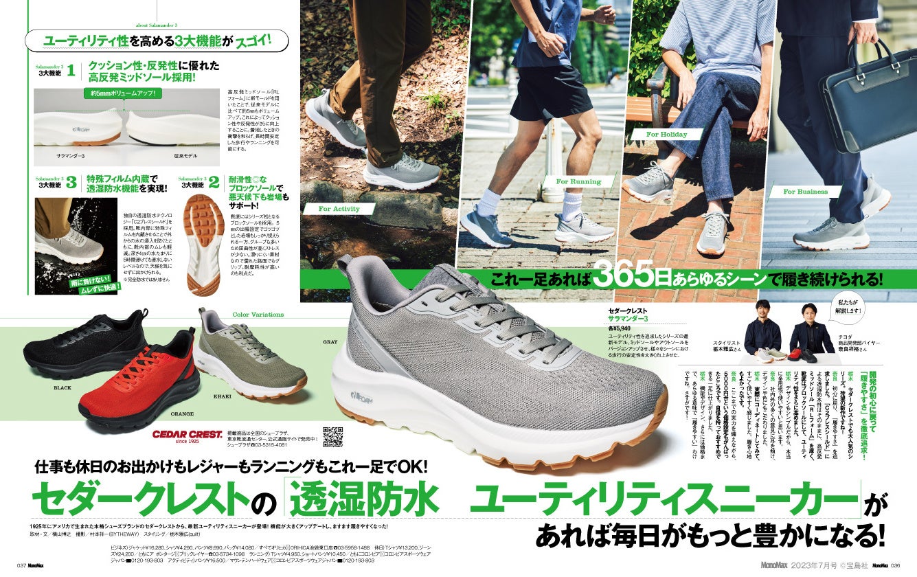 仕事も休日も、レジャーもランニングも、これ一足でOK! セダークレストの「透湿防水ユーティリティスニーカー」が、さらに進化して登場!モノ・トレンド雑誌「MonoMax」にも紹介中。
