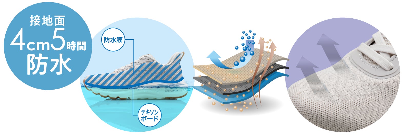 靴内部に特殊フィルムを内蔵し、外から水の侵入を防ぎ、靴内部のムレを軽減します。
