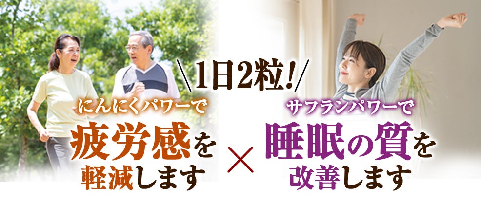 にんにくサフランW(ダブル)に含まれる機能性関与成分は、一時的な身体的・精神的疲労感を軽減(※1)すると報告、また日中の睡眠の質を改善(※2)すると報告されており、「毎日よく活動して、しっかり休む」という健康的な活動サイクルをサポートします。