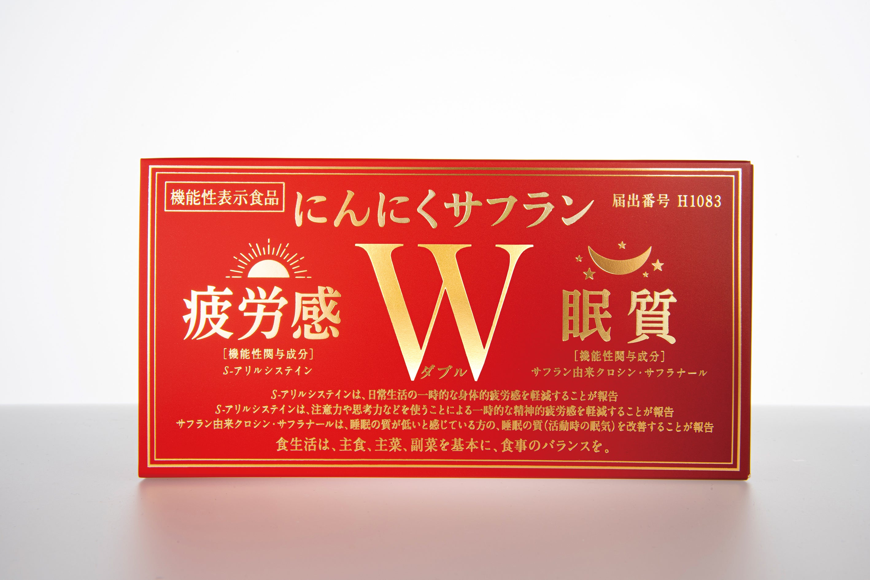 届出表示:本品には、S-アリルシステインとサフラン由来クロシン、サフラン由来サフラナールが含まれています。S-アリルシステインは、毎日の摂取により、日常生活の一時的な身体的疲労感を軽減することが報告されています。また、 S-アリルシステインは、注意力や思考力などを使うことによる一時的な精神的疲労感を軽減することが報告されています。サフラン由来クロシン、サフラン由来サフラナールは、睡眠の質が低いと感じている方の睡眠の質(活動時の眠気)を改善し、物事をやり遂げるのに必要な意欲を維持することが報告されています。