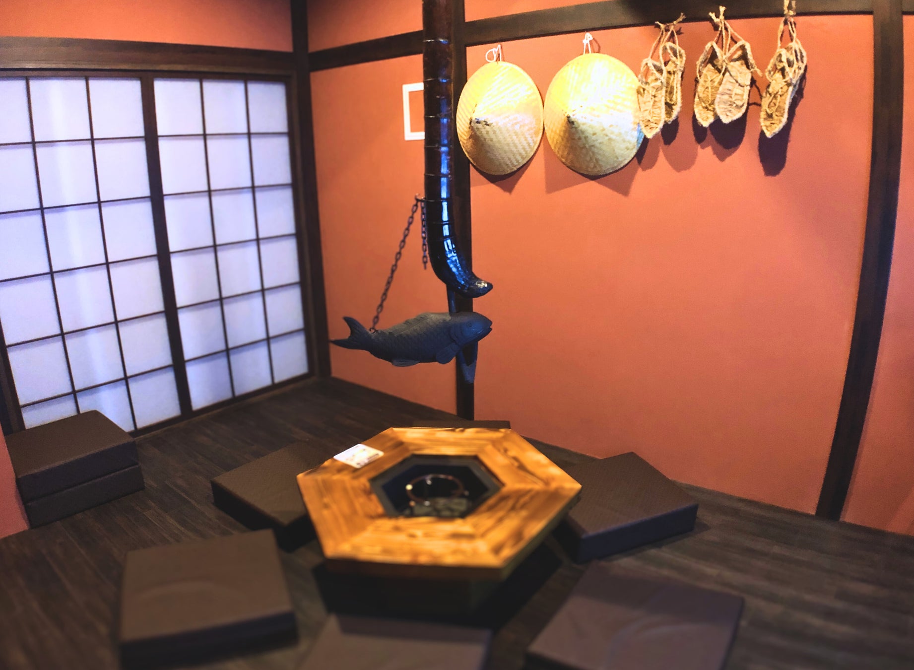 坂本龍馬と中岡慎太郎が暗殺された歴史的な「近江屋」をイメージしたこのルームでは、討ち入りを再現しており、刀や実際に飾られていた掛け軸のレプリカも設置しております。また、ルームのご利用でお抹茶とカステラをお召し上がりいただけます。