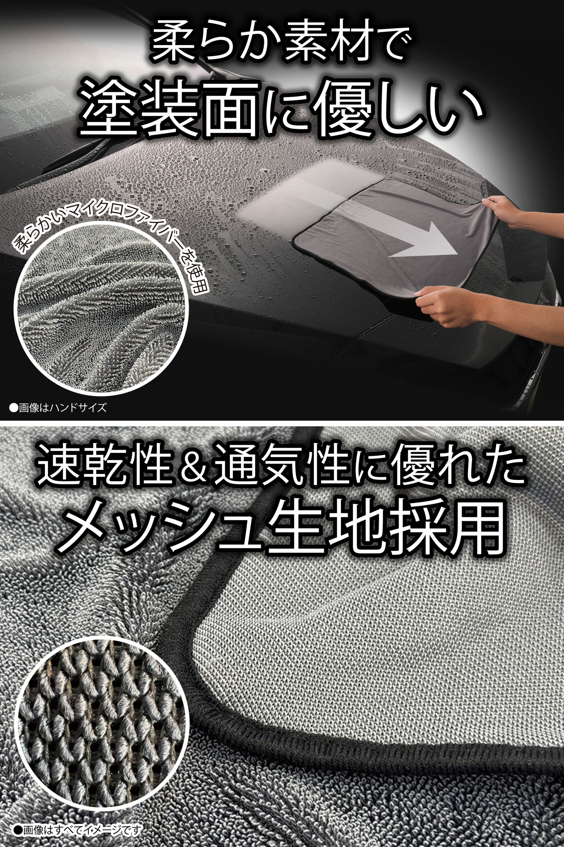 柔らかいマイクロファイバー生地で、強くこすらなくてもしっかりと吸水。コーティング車にも最適