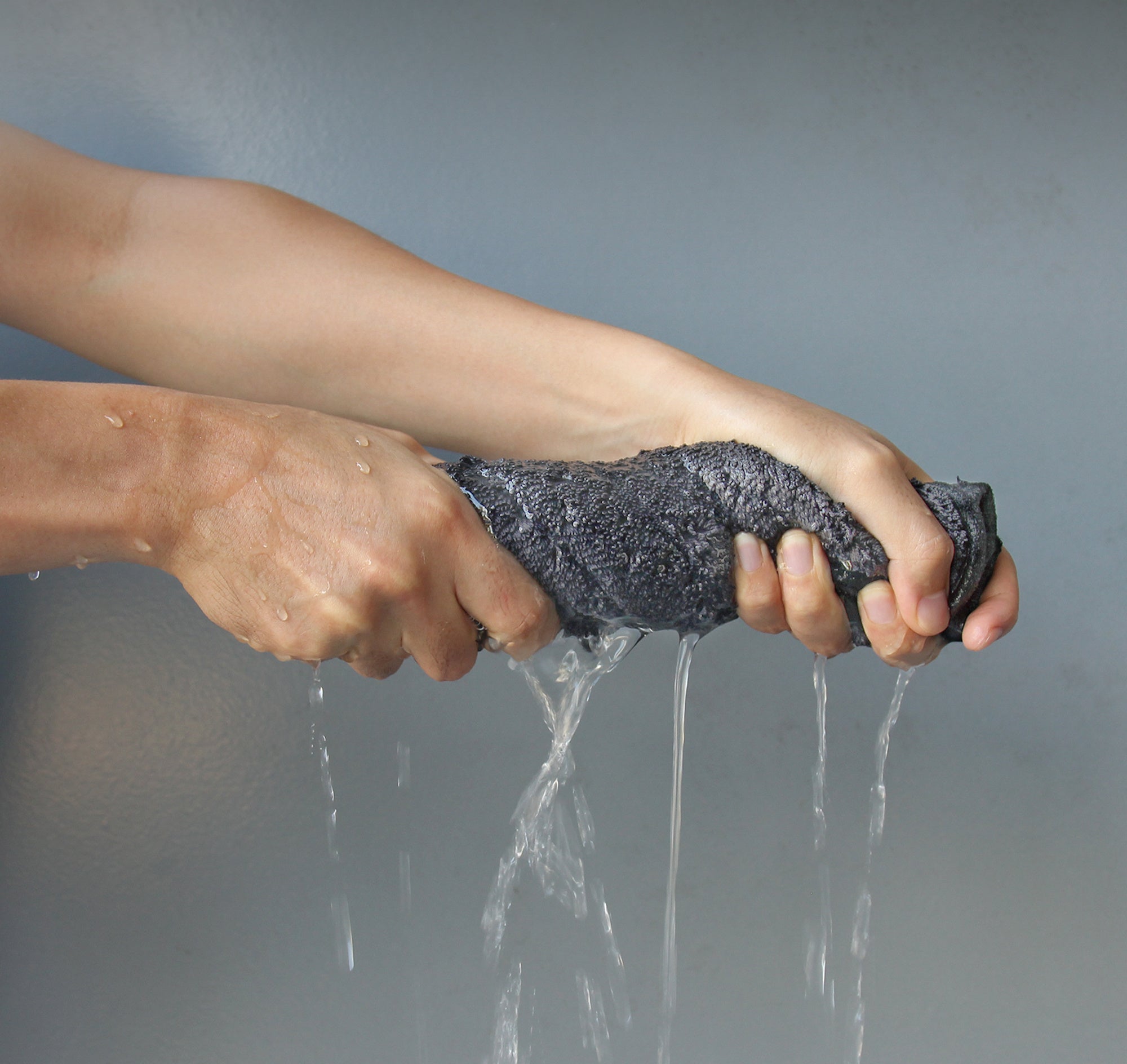 長い毛足がねじれた“ツイストループ”構造によって、一般的な綿タオルやマイクロファイバータオルよりも表面積が広く、1度に吸水できる量が多い。拭きあとが残らないため、水アカやシミの付着を防止