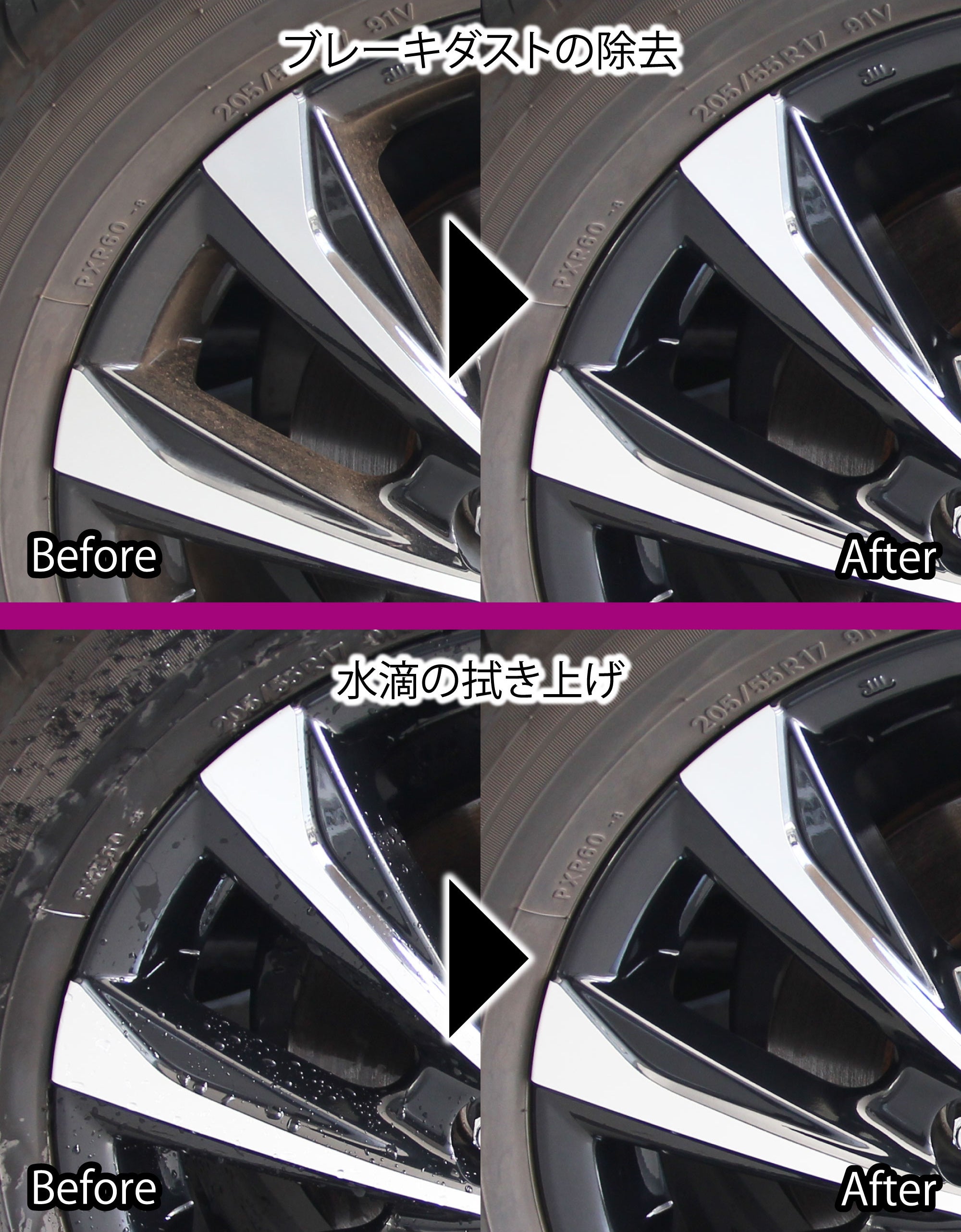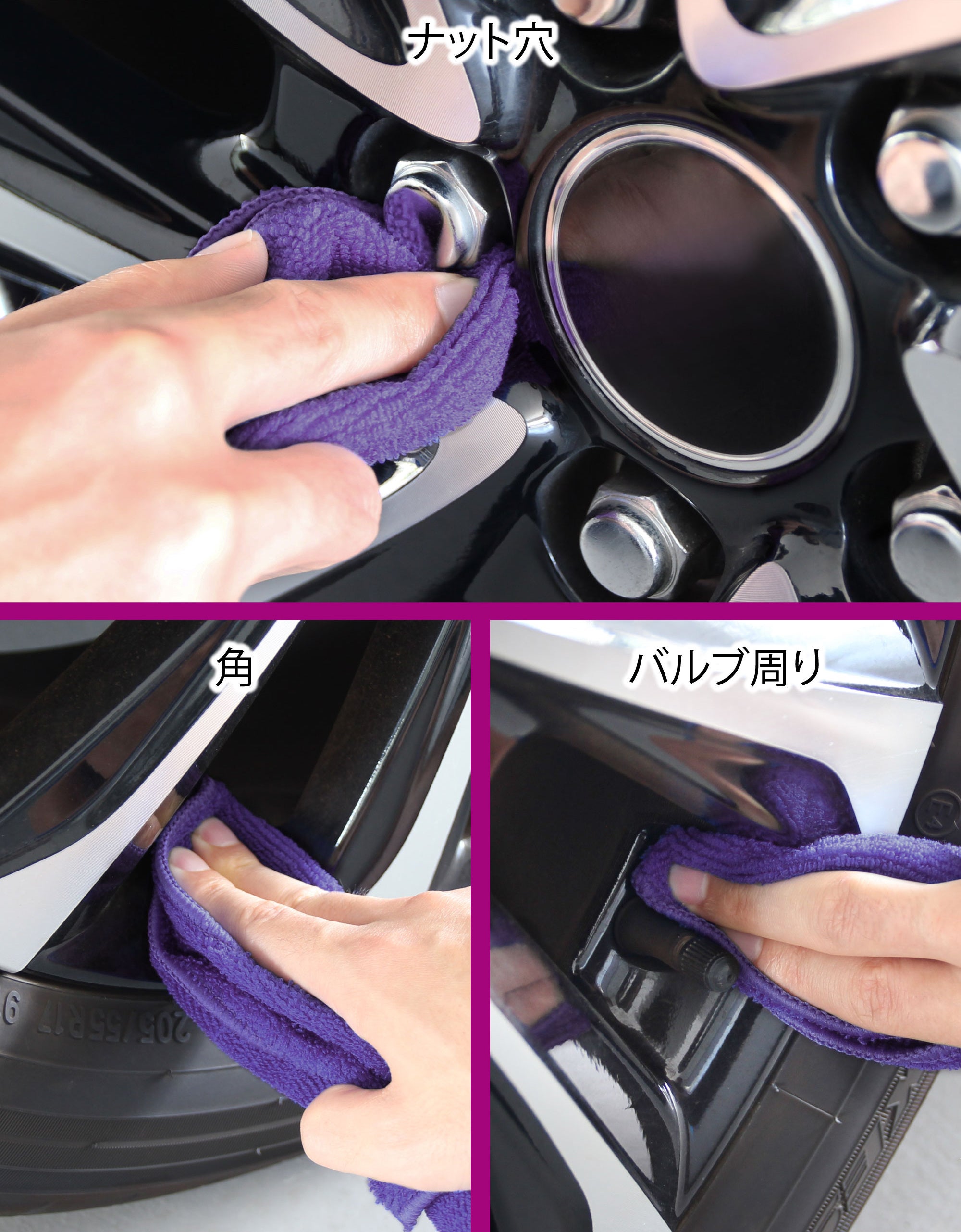 ホイール洗浄後の水滴の拭き取りとしても使用可能。ウォータースポットの軽減やホイールコーティング前の拭き上げにおすすめ