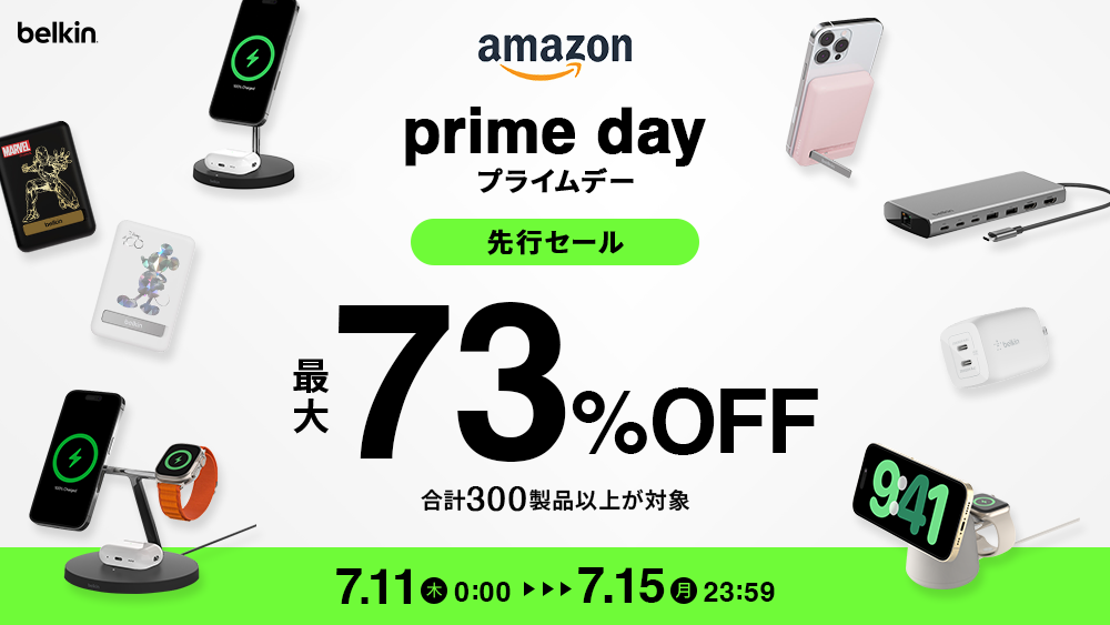 米カリフォルニア発、洗練されたデザインと快適なライフスタイル体験を提案し、グローバルで絶大な人気と市場シェアを誇るスマートフォン・PC関連製品ブランド「Belkin」の日本法人、ベルキン株式会社(以下Belkin、所在地:東京都中央区京橋)は、7月11日(木)~7月17日(水)(先行セール期間含む)にて開催するAmazonプライムデーにて、大人気のMagSafe充電器やドッキングステーションをはじめとする最新製品などを中心に、全297製品を最大73%オフのセール価格にて販売いたします。対象製品から一部製品を先行公開します。