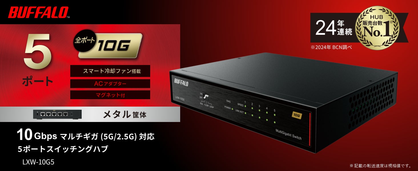 株式会社バッファロー(本社:東京都千代田区、代表取締役 社長執行役員CEO:牧 寛之)は、10GbE(10ギガビットイーサネット)に対応したLANポートを5ポート搭載した家庭用スイッチングハブ「LXW-10G5」を2025年6月上旬より順次出荷、販売いたします。