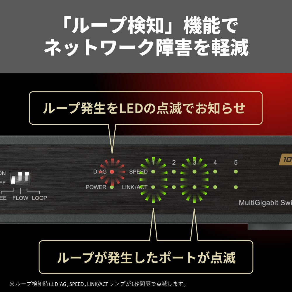 また、ネットワーク運用に大きな障害をおよぼす「ネットワークループ」の発生を検知し、お知らせするループ検知機能を搭載しているので、安定したネットワークの構築を実現します。