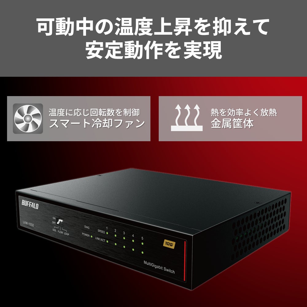 放熱性に優れた金属筐体を採用し、高信頼・静粛性が求められる法人向けNAS「テラステーション」シリーズやビジネススイッチなどの法人向け製品が搭載しているものと同様の制御機能を持つ「スマート冷却ファン」を搭載しています。