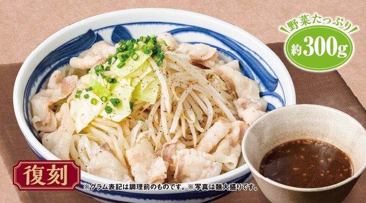 お客さまからの要望にお応えし3年ぶりに復活したメニュー。約300gのたっぷり野菜を魚介系濃厚スープのつけ汁で。(※グラム表記は調理前のものです。)