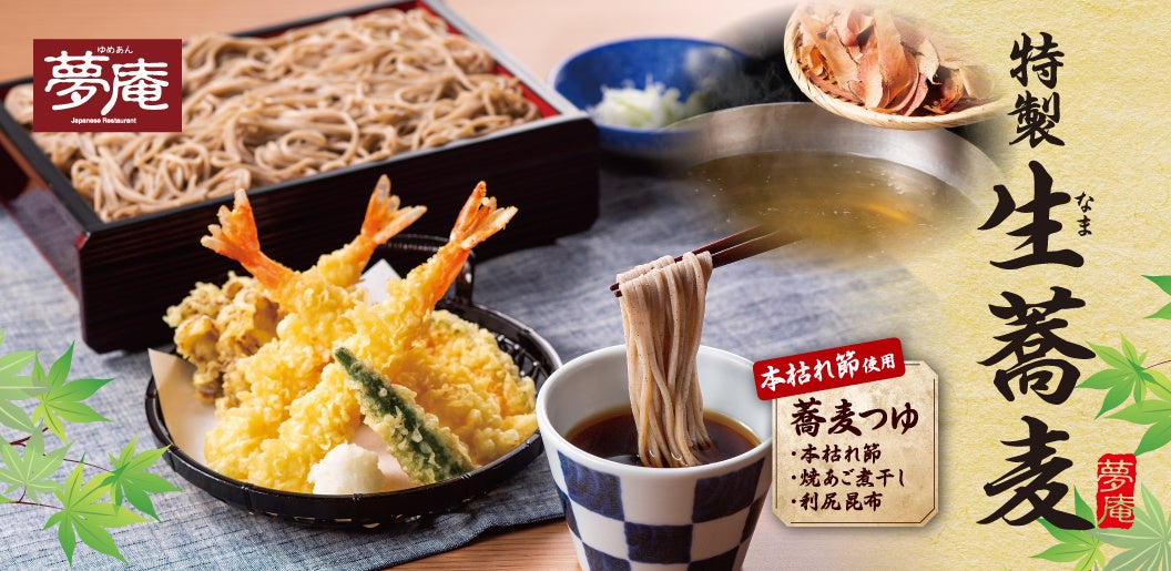 | 【夢庵“全力リニューアル”おすすめポイント】 ① 【リニューアル】そばとつゆが進化した夢庵の新しい“生(なま)蕎麦”が全17種 「挽ぐるみそば粉」と「更科系そば粉」をブレンドした風味豊かなのど越しの良い“生(なま)蕎麦”と、そば本格専門店で使用する「本枯れ節」「利尻昆布」を贅沢に使ったそばつゆにリニューアルしました。 ② 【お得】 “美味しい・お手頃・ボリューム満点”なランチサービスを拡充 ※ 対象商品が”大盛無料“・”サービス価格“・”セット価格“で、お得にランチをお楽しみいただけます。 ③ 新メニューが15品以上追加!お客さまの要望に応えた“復刻メニュー”も登場 麺類・御膳・丼ものを中心に新メニューが登場。大人気の「夢郎うどん(そば)」も3年ぶりに復活します。 |