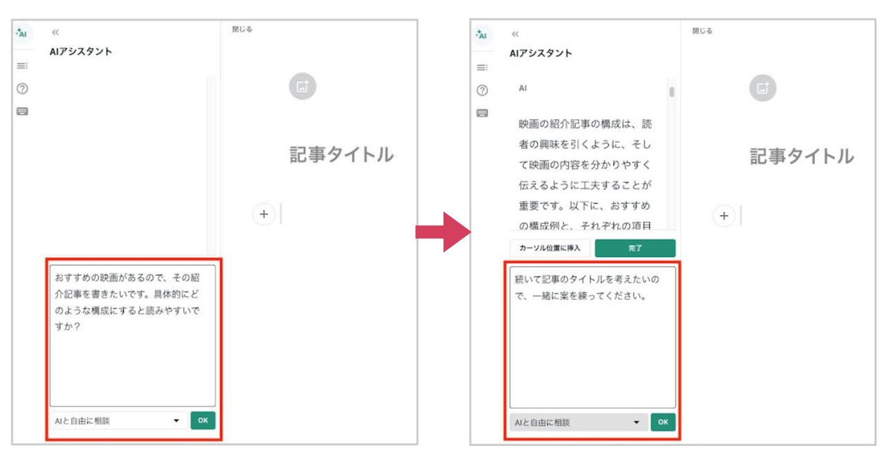 AIアシスタントに「面白そうな切り口を教えて」と質問し、やり取りを重ねることで記事の大枠やトーンを調整できます。