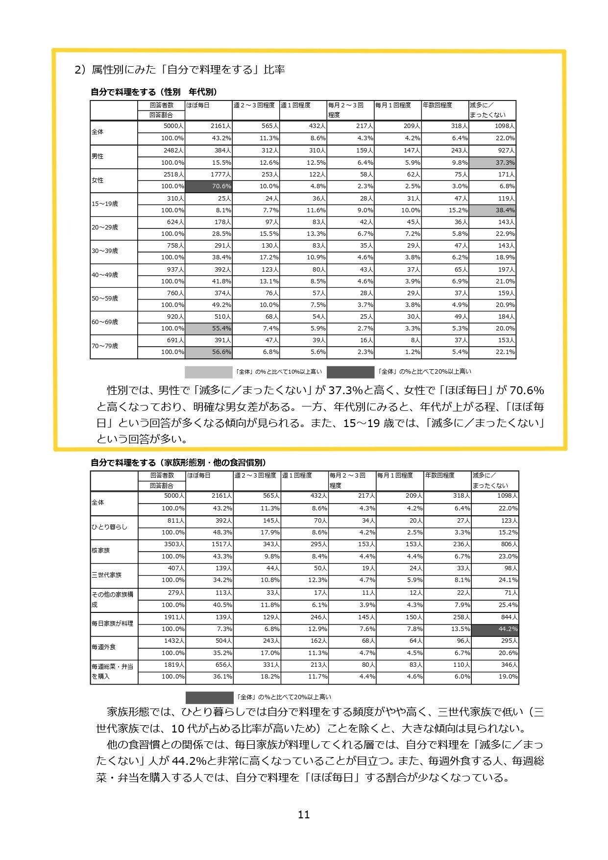 文化庁地域文化創生本部事務局が発表している「平成30年度 生活文化調査研究事業報告書」https://www.bunka.go.jp/tokei_hakusho_shuppan/tokeichosa/seikatsubunka_chosa/pdf/r1414723_01.pdfによると、「ほぼ毎日自分で料理をする」と回答した人は、男性が15.5%だったのに対し、女性は70.6%と大幅に上回る結果となっておりました。