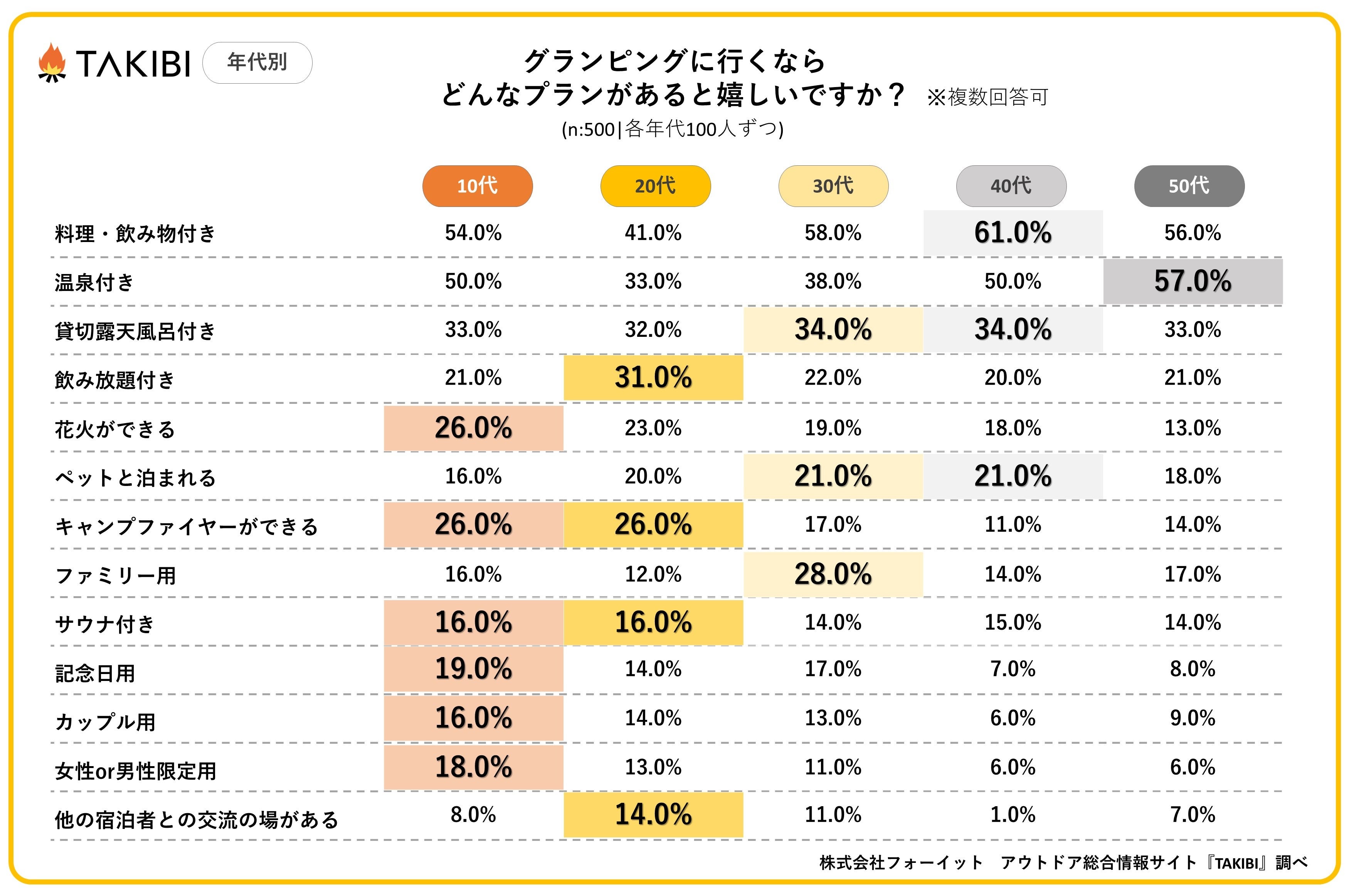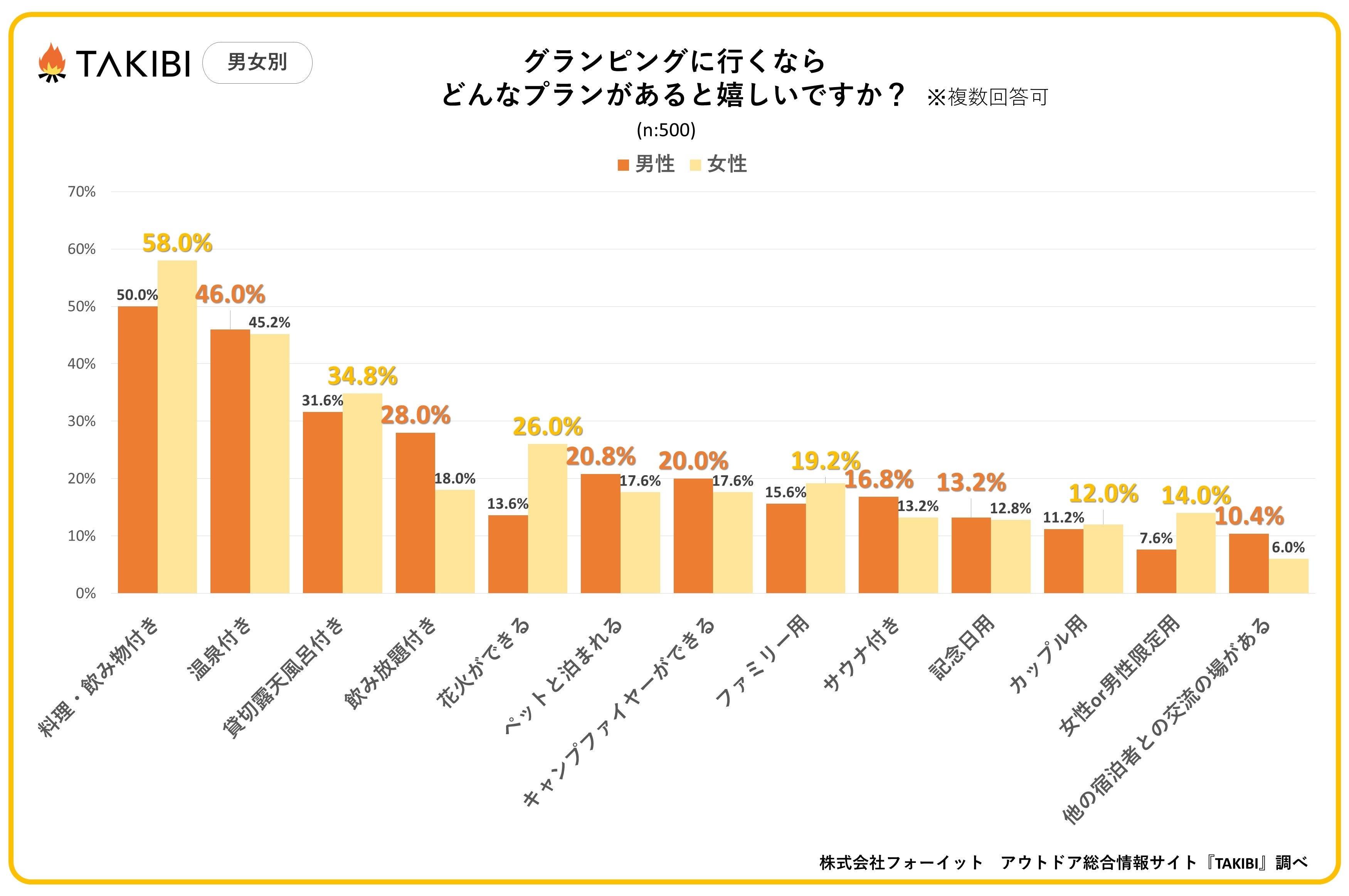 キャンプやグランピングを中心としたアウトドア総合情報サイト「TAKIBI」の運営をおこなう株式会社フォーイットは、全国の10代~50代までの男女500人を対象にグランピングに関するアンケートを実施し、男女別・年代別等の特徴についてまとめました。