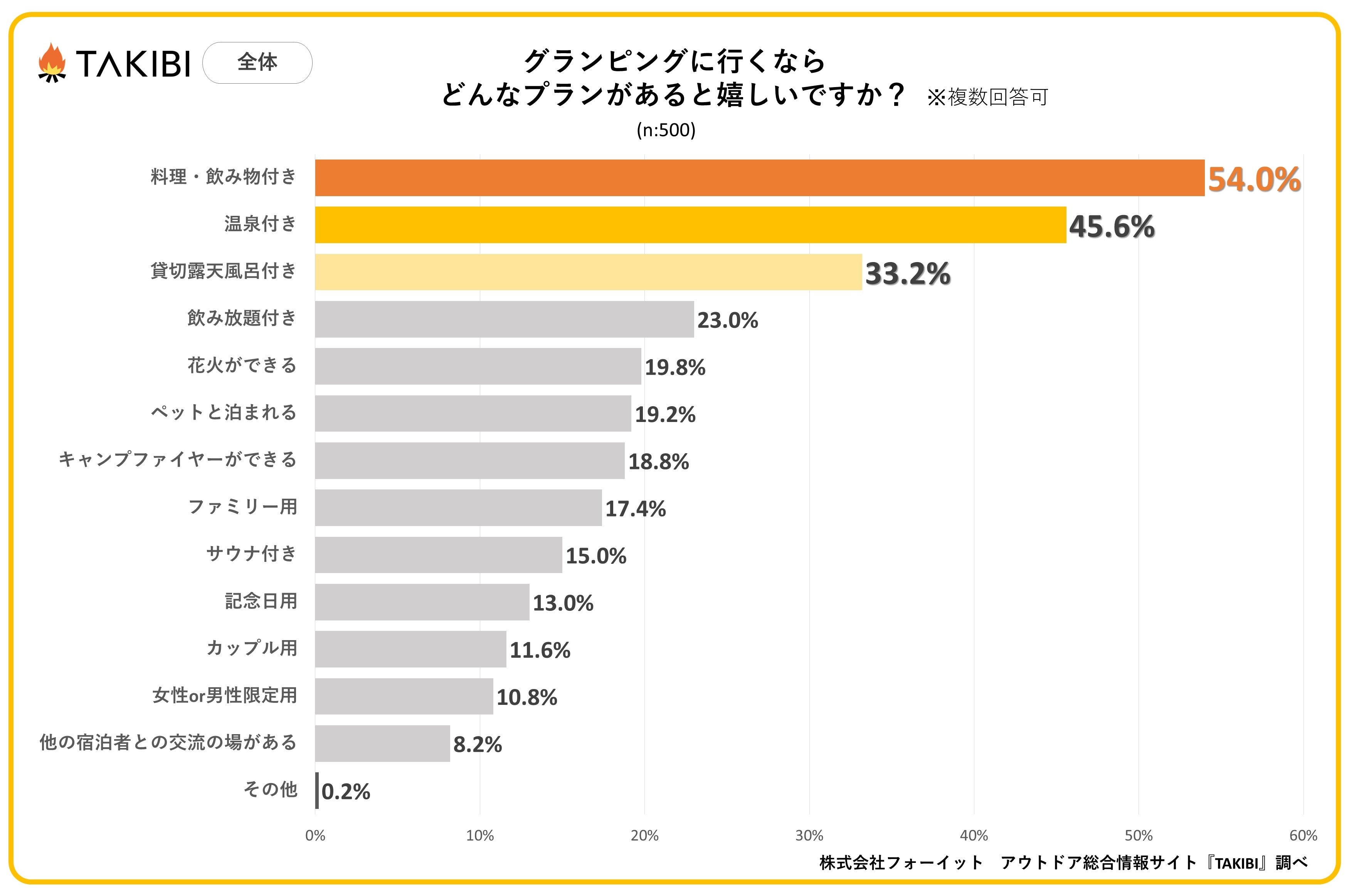 全国の10代~50代の男女を対象とした「グランピングに行くならどんなプランがあると嬉しいですか?」というアンケートを行ったところ、最も多かった回答は「料理・飲み物付き」プランで54.0%という結果になりました。次いで、「温泉付き」が45.6%、「貸切露天風呂付き」が33.2%と続きました。
