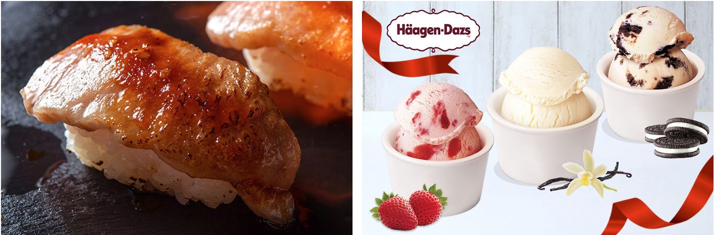 右:お肉料理を堪能した後は、ハーゲンダッツアイスクリームをどうぞ。濃厚なバニラや、クッキー&クリームなど、人気ラインナップを食べ放題でお好きなだけお楽しみください。