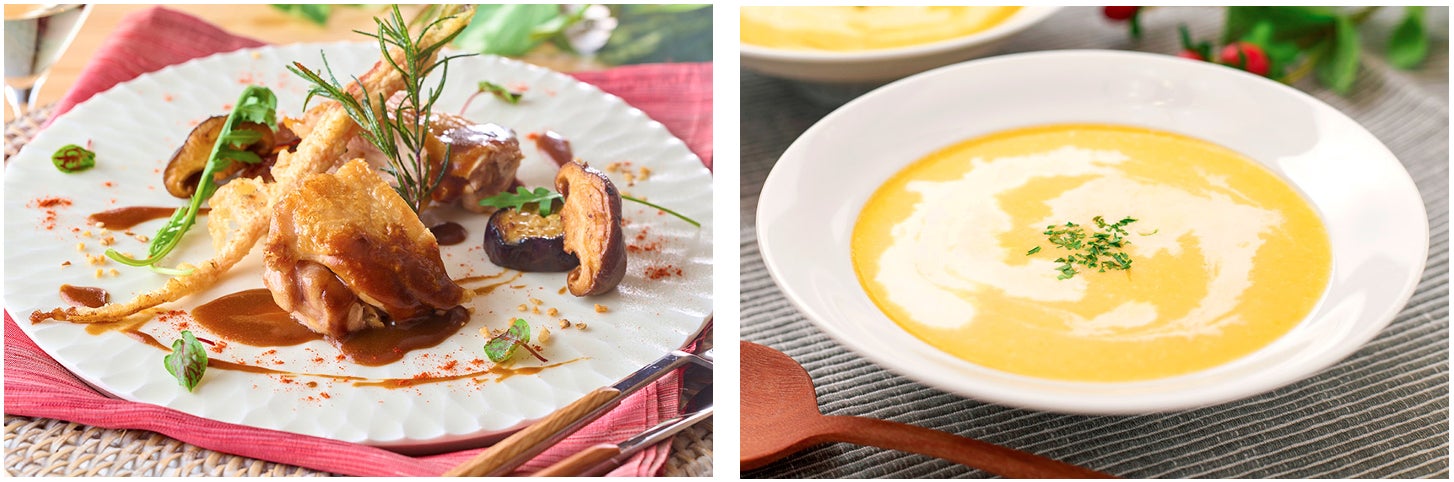 左:【カチャトラ風チキンのソテー 山椒の香り】。皮目をパリパリに焼き上げた鶏肉に、隠し味に山椒を加えたトマトソースを添えて。山椒のピリリとした辛みが感じられる、夏にぴったりのメニューです。