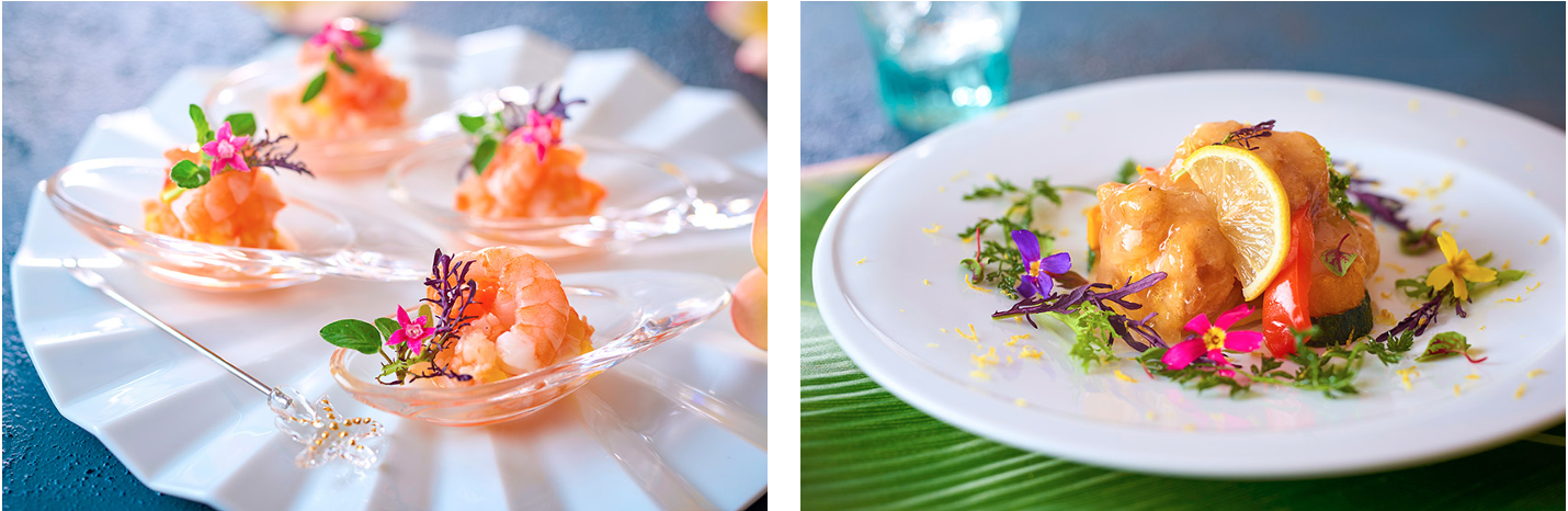 左:海老と夏野菜を使ったアミューズは、さっぱりとした味わいが夏にぴったりの一品。