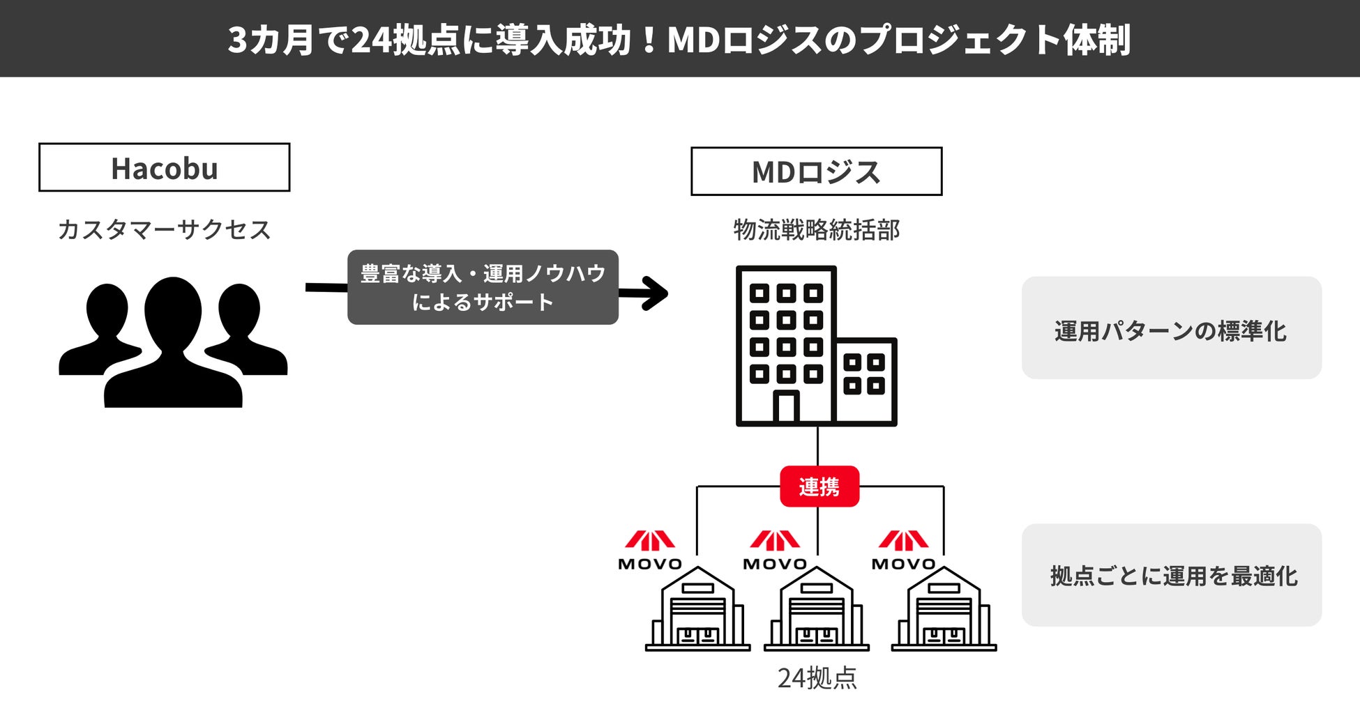 データの力で物流課題を解決する株式会社Hacobu(ハコブ、本社:東京都港区、代表取締役社長CEO 佐々木 太郎、以下「Hacobu」)は、MDロジス株式会社(本社:東京都中野区、代表取締役:四方 壽一、以下「MDロジス」)が、Hacobuが提供するトラック予約受付サービス「MOVO Berth (ムーボ・バース)」を、MDロジスの運営する24拠点に2024年1月~3月のわずか3カ月で導入を完了させ、全拠点の荷待ち・荷役時間のデータを取得することに成功した事例を公開しました。
