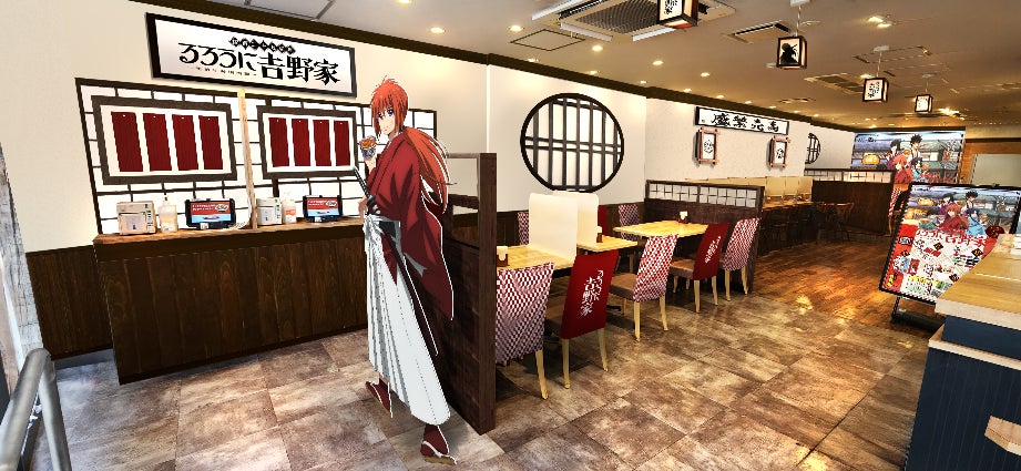 また、期間限定で吉野家押上店(東京都墨田区)を、るろうに剣心の作中でも登場する牛鍋屋『赤べこ』をイメージした装飾にします。吉野家の創業時期でもある明治時代を描いた「るろうに剣心」の世界観に合わせ、店舗装飾や店舗スタッフのユニフォームをあしらいますので、をぜひお楽しみください。