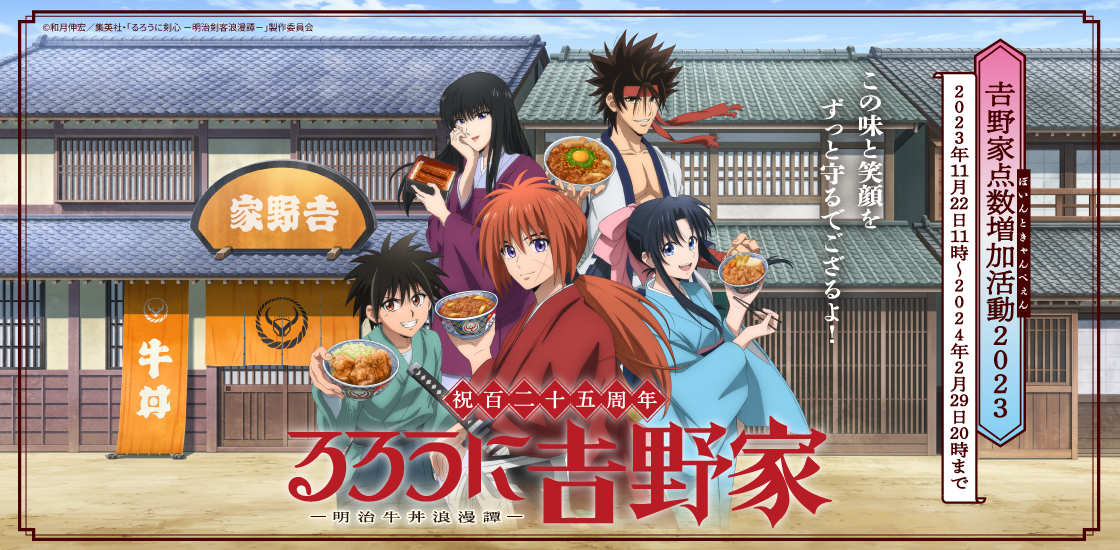 株式会社吉野家(本社:東京都中央区、代表取締役社長 河村泰貴)は、全国吉野家店舗※で2024年1月30日(火)11時から2024年2月29日(木)20時までの期間、TVアニメ「るろうに剣心 -明治剣客浪漫譚-」とコラボレーションキャンペーン第弐弾を開催します。2023年11月22日(水)から実施していますコラボキャンペーン第壱弾の点数増加活動(ポイントキャンペーン)『るろうに吉野家 –明治牛丼浪漫譚-』も、2024年2月29日(木)20時まで開催していますので、引き続き点数(ポイント)の付与と特典との交換をお楽しみいただけます。