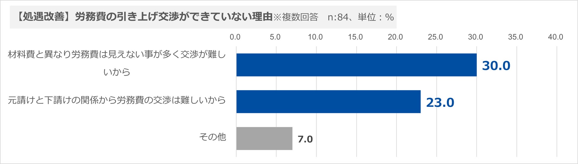 1-2.「労務費・労務単価の引き上げを元請け(工事発注会社)に交渉できていない」と回答した74名に、交渉できていない理由を尋ねたところ(複数回答)、最多は「材料費と異なり労務費は見えない事が多く交渉が難しい(※5)から(30.0%)」、次いで「元請けと下請けの関係から労務費の交渉は難しいから(23.0%)」、「その他(7.0%)」との結果となった。