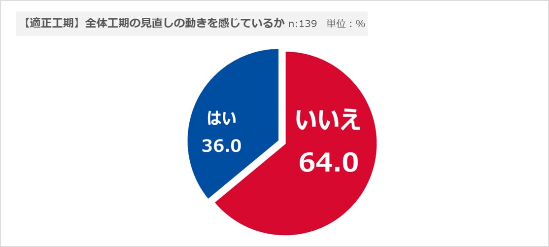 内装仕上げ工事業の従事者139名に「全体工期の見直しの動きを実際に感じていますか?」と尋ねたところ、「はい」と回答したのは36.0%、「いいえ」が64.0%だった。