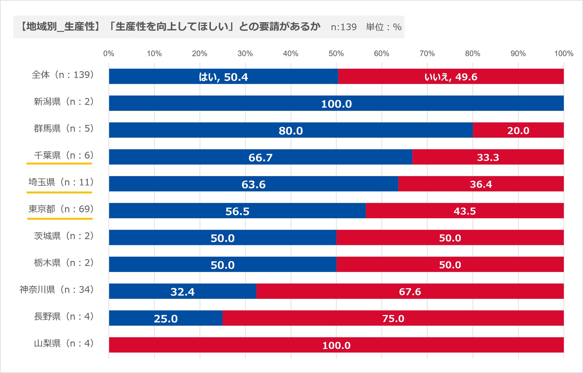 1-1.地域別に「元請け(工事発注会社)から、“生産性を向上してほしい”との要請がある」との回答率(「はい」との回答率)をみると、2024年4月度着工建築物床面積(非居住用)が2023年4月と比べて増加傾向にある都道府県のうち千葉県(66.7%)、東京都(56.5%)、新潟県(100%)が、全体(50.4%)よりも上振れしていた。