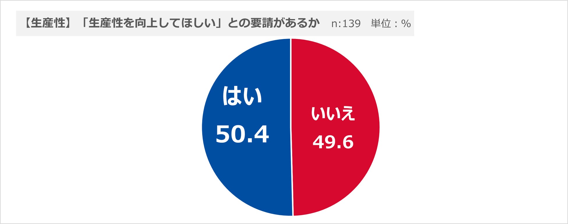 4.【生産性】内装仕上げ工事業の従事者139名に「元請け(工事発注会社)から、“生産性を向上してほしい”との要請はありますか?」と尋ねたところ、「はい」と回答したのは50.4%、「いいえ」が49.6%だった。