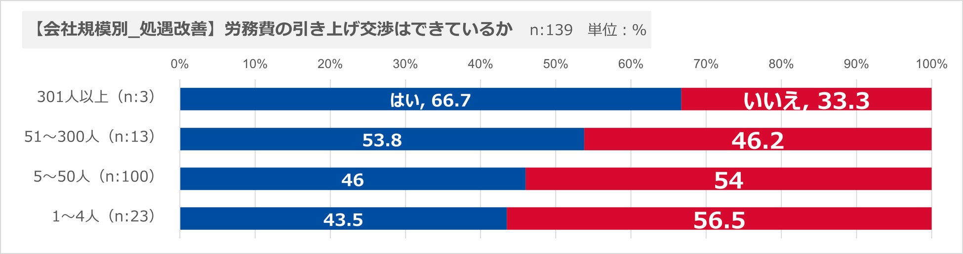 1-1.会社規模(従業員数)別に「労務費・労務単価の引き上げを元請け(工事発注会社)に交渉できている」との回答率(「はい」との回答率)みてみると、1~4人(n:23)で43.5%、5~50人(n:100)で46%、51~300人(n:13)で53.8%、301人以上(n:3)で66.7%、と、会社規模が大きいほど「労務費・労務単価の引き上げ交渉」ができていることが分かる。