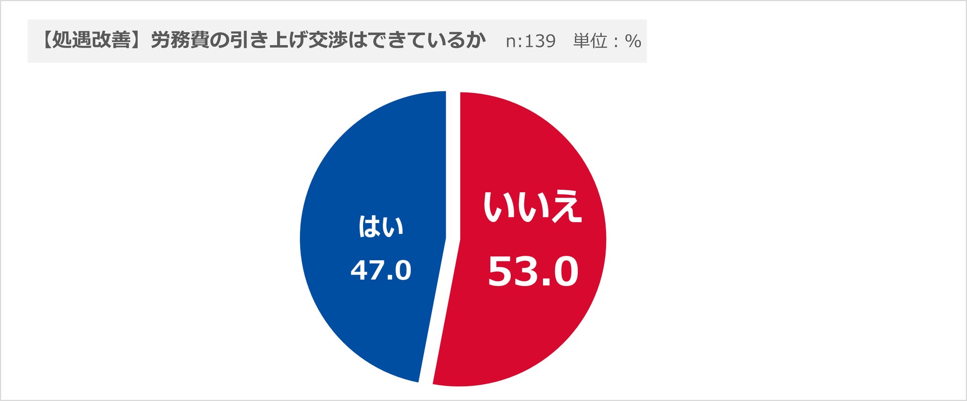 内装仕上げ工事業の従事者139名に「労務費・労務単価の引き上げを元請け(工事発注会社)に交渉できていますか?」尋ねたところ、「はい」と回答したのは47.0%、「いいえ」が53.0%だった。