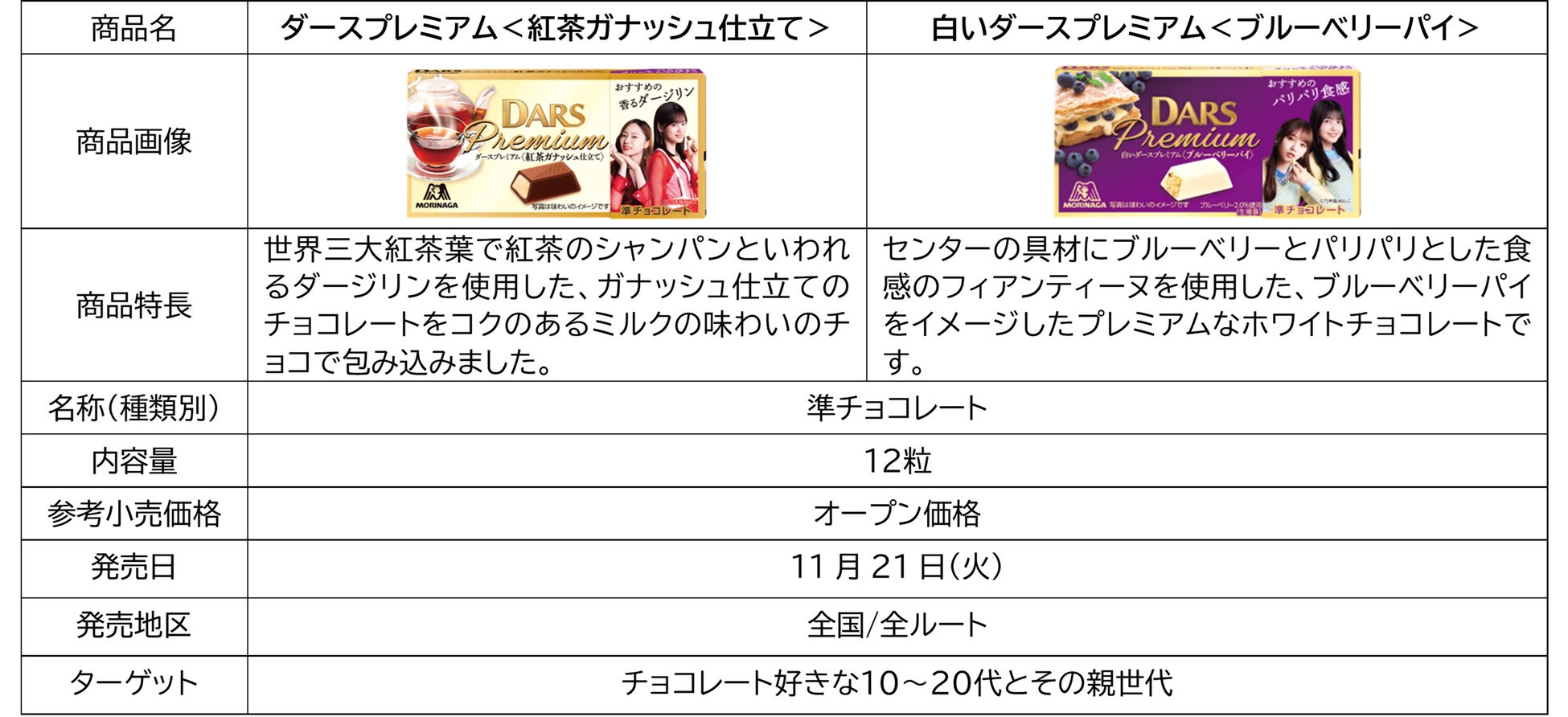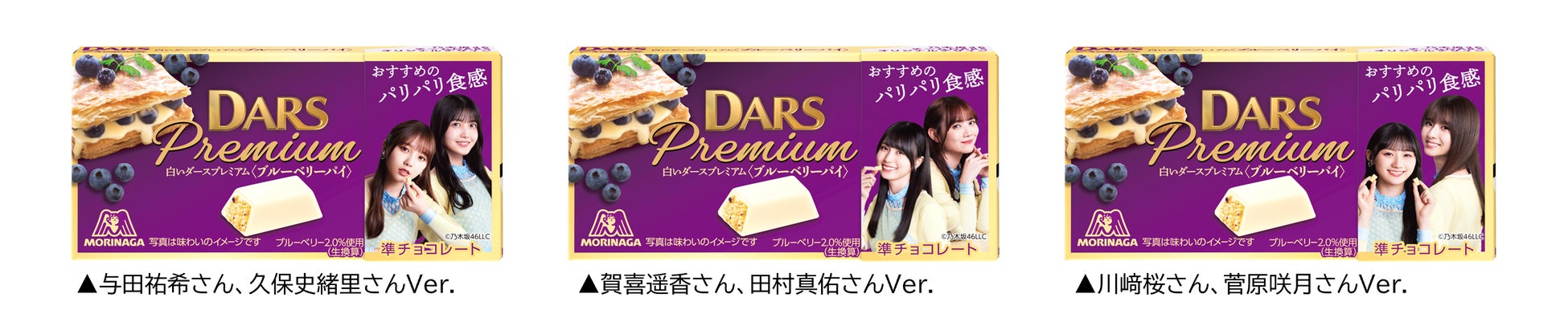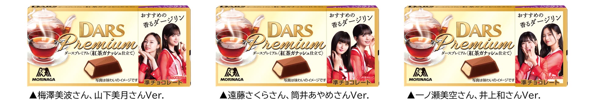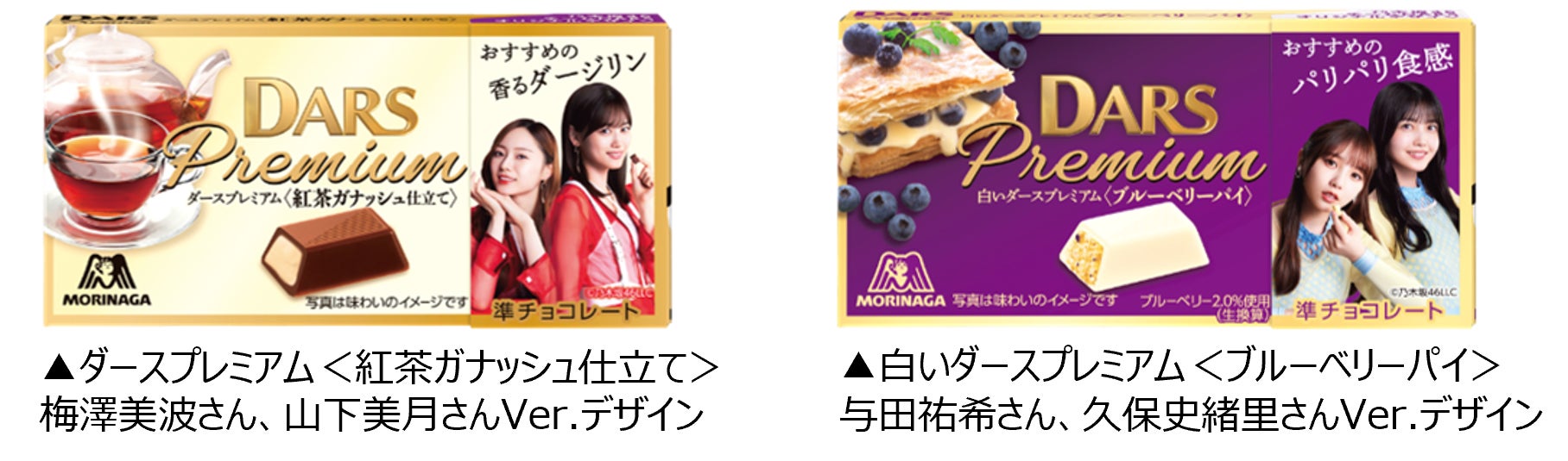 また、「ダースプレミアム」では新商品<紅茶ガナッシュ仕立て><ブルーベリーパイ>の2種を、乃木坂46のアンバサダーメンバーがパッケージに印刷された限定デザインで11月21日(火)より発売いたします。コラボレーションパッケージデザインは全6種で、各フレーバー3種の展開です。