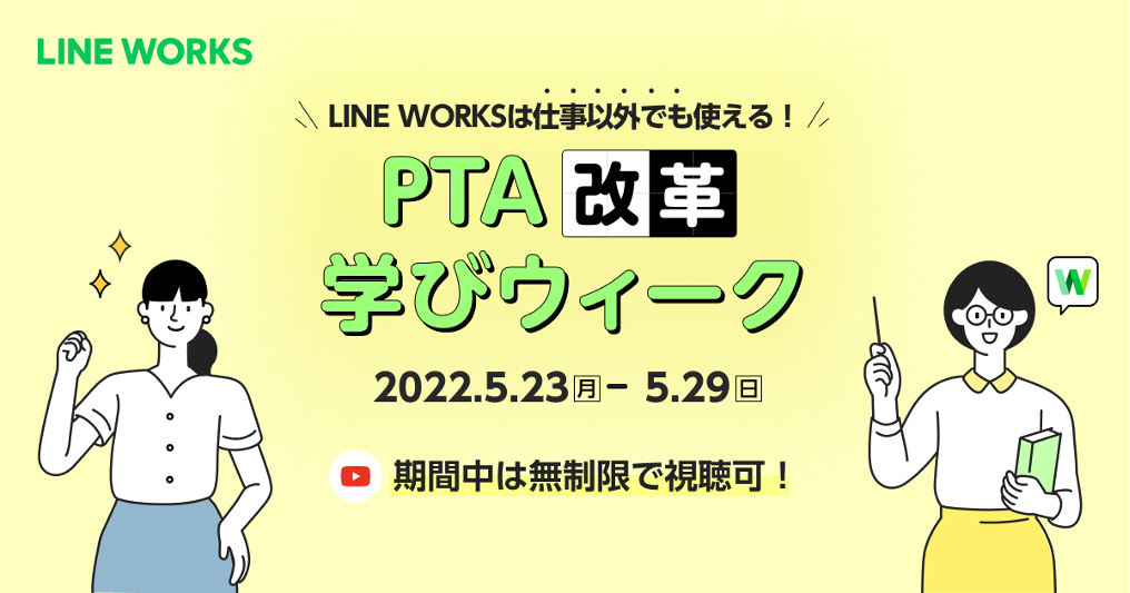 はたらく現場のコミュニケーションツール「LINE WORKS」を提供するワークスモバイルジャパン株式会社(本社:東京都渋谷区、代表取締役社長:福山 耕介、以下 ワークスモバイルジャパン)は、PTAの運営に携わる方向けに、長引くコロナ禍をきっかけに望まれているPTA運営のオンライン化について、具体的な対応方法、成功事例、オンライン化によって発生する各種課題への対策などをご紹介するカンファレンス「オンラインでもっと楽しく PTA改革 学びウィーク」を開催いたします。