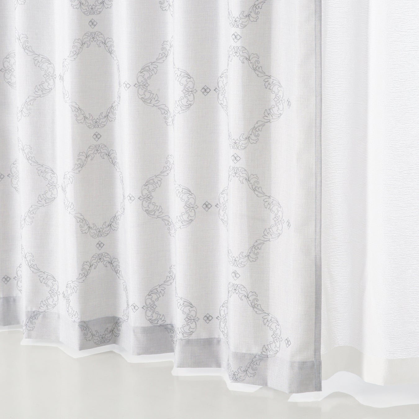 シャンブレー調の上品な生地に、シルバーのラメ刺繍で美しい曲線のオーナメントモチーフを施したカーテンです。シンプルながらもこだわりあるデザインです。