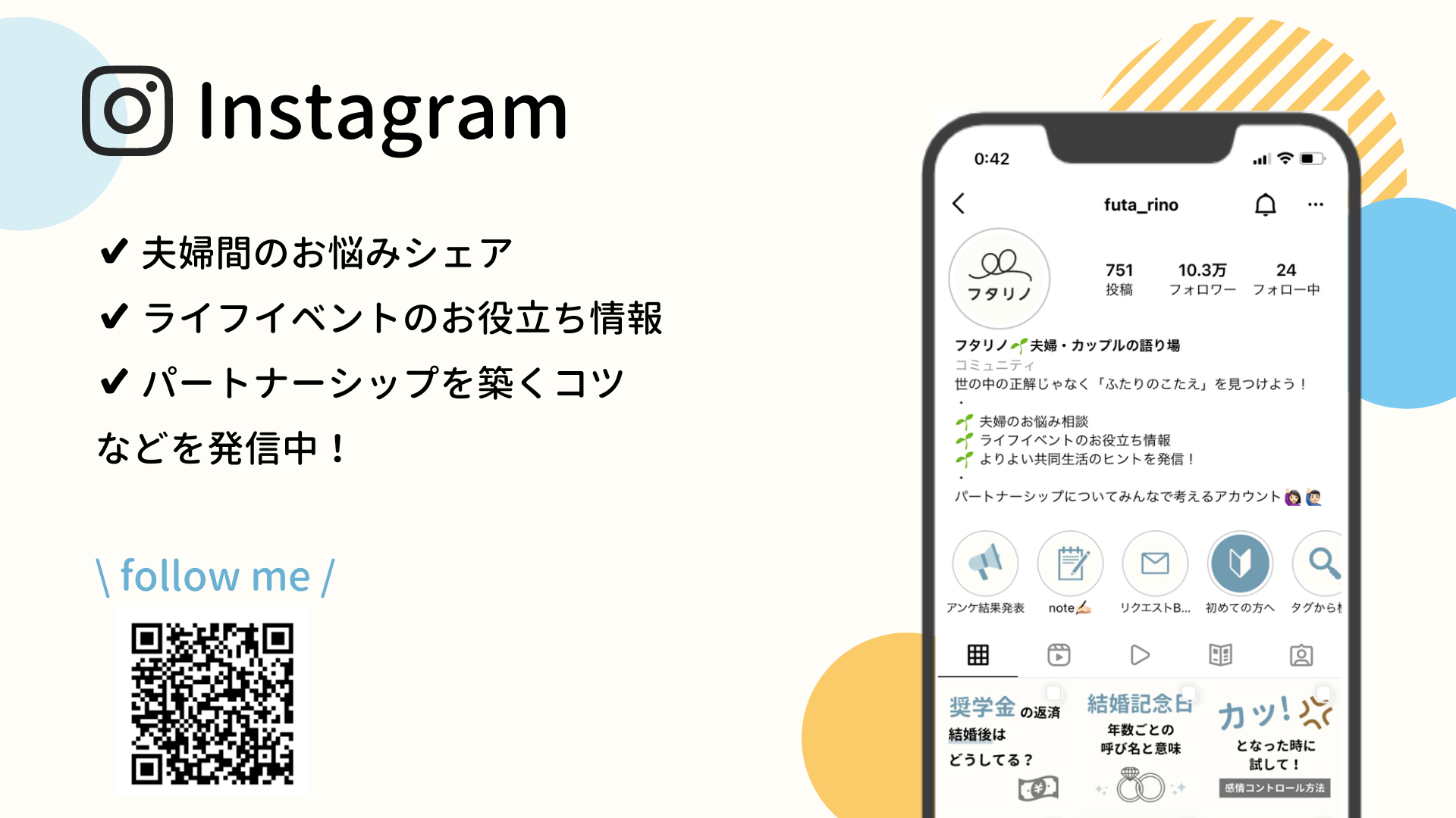 公式Instagram(フォロー無料)では、パートナーシップの構築に役立つ情報を配信しています。「みんなはこんなときどうしているのだろう?」といった、パートナーシップに関するお悩みなど、匿名でのご相談も承っています。