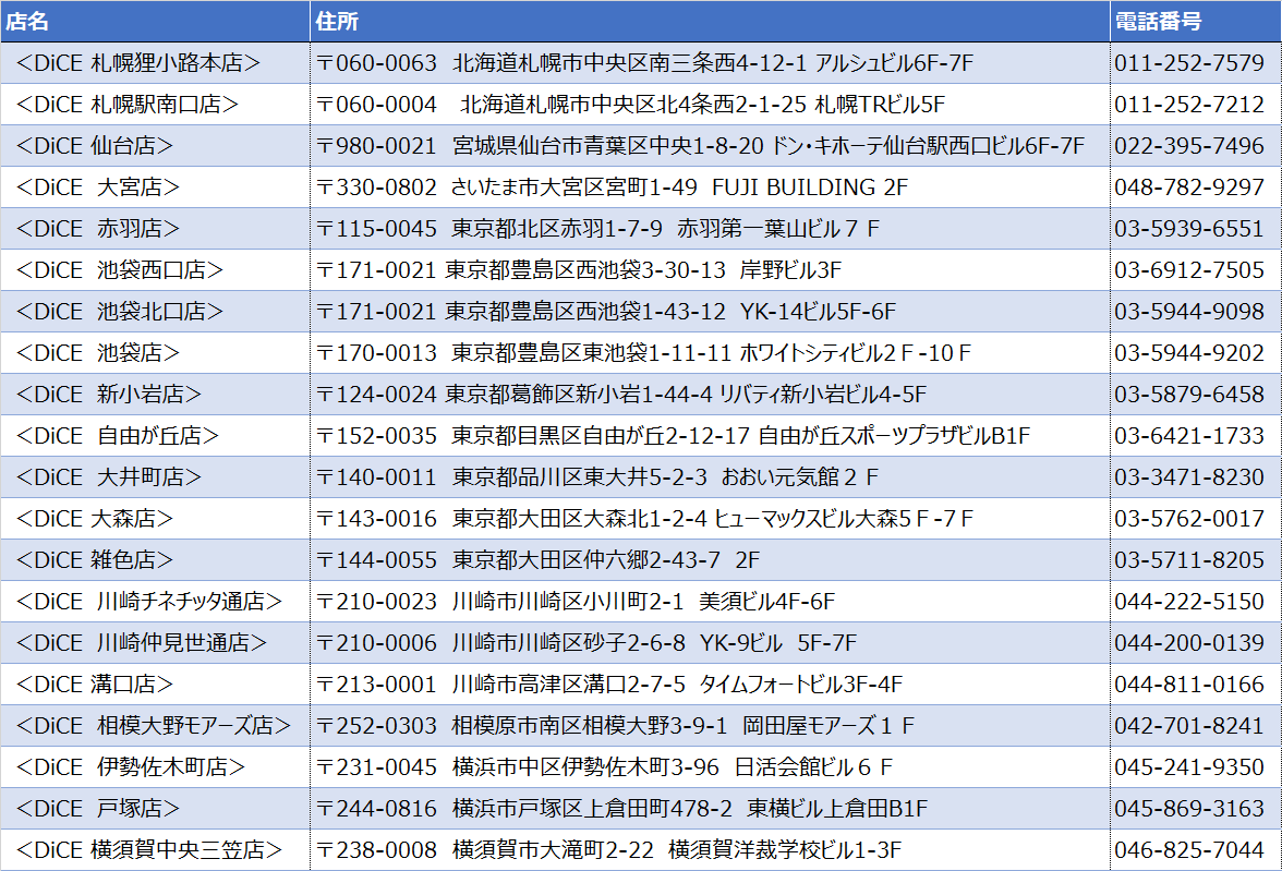 「DiCE」 は、2000 年より関東を中心に展開しているインターネットカフェです。高級感や清潔感などから、多くの女性のお客様にもご好評を得ています。豊富な雑誌・コミック、フリードリンクに加え、ソフトクリームに関しては「ソフトクリームに本気すぎるネットカフェ」として毎月違う味の提供や、他社とのコラボも行っています。また、グループ利用に最適な完全個室の VIPルームに加え、ダーツ・カラオケ・ビリヤードそして e スポーツ等のアミューズメントコンテンツもお楽しみいただけます。「暇をつぶす」ネットカフェから「時間を作って通いたい」ネットカフェに。