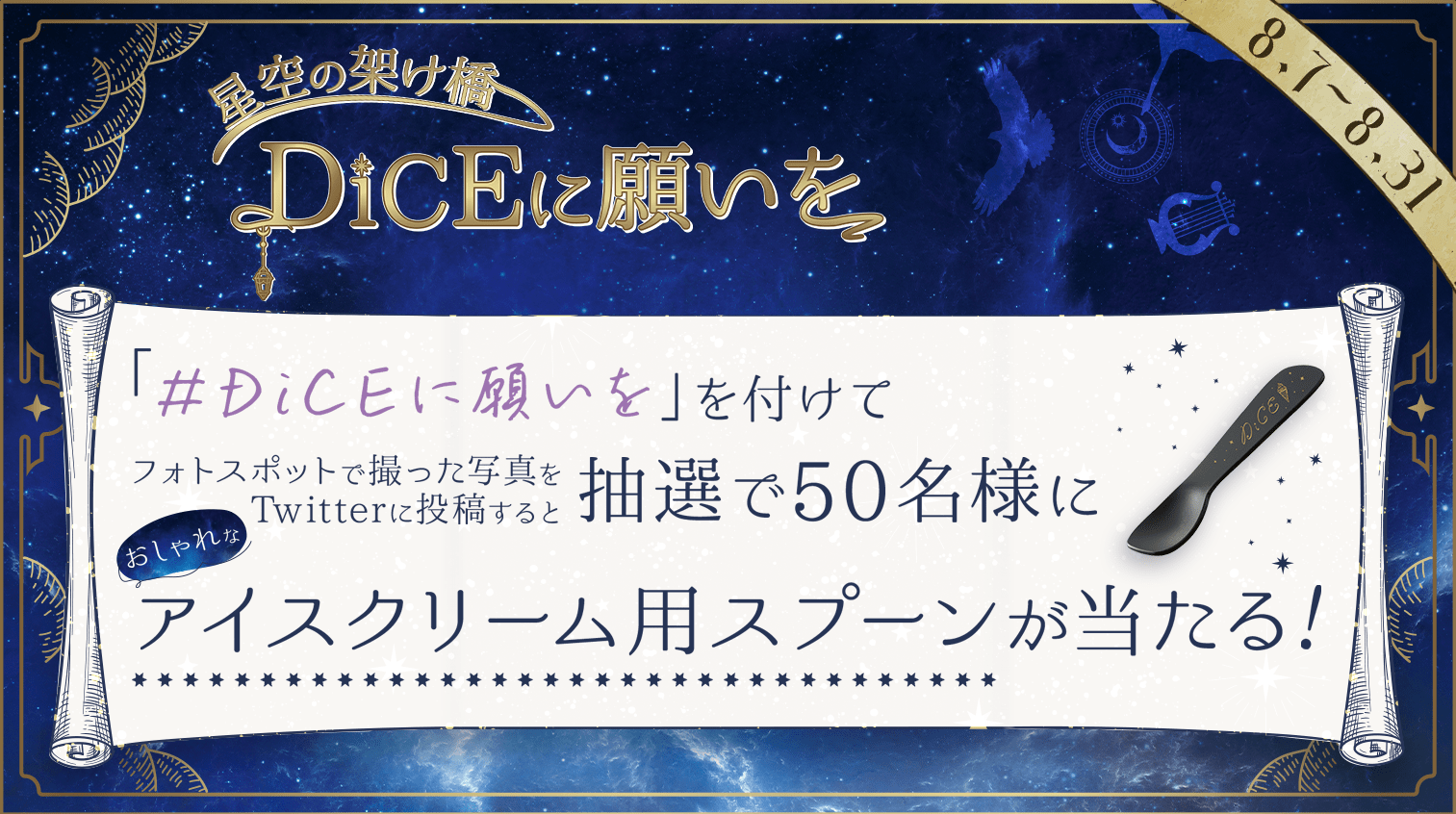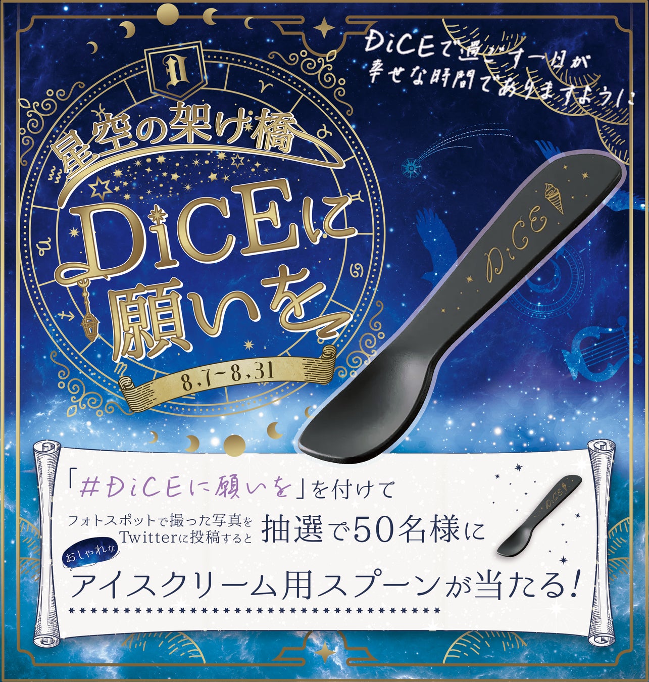 専用ハッシュタグ「#DiCEに願いを」をつけてX(Twitter)に投稿すると、抽選で50名様にオリジナル「アイスクリーム用スプーン」が当たるイベントを開催いたします。