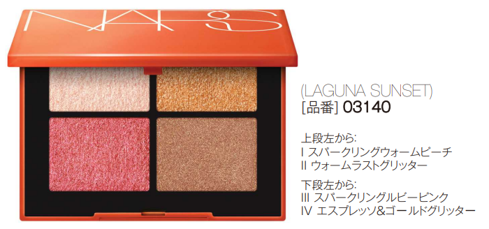 太陽にキスされたかのような情熱的な色気。高まる熱。激震が走る目もとに。 ベストセラー“LAGUNA”シェードにインスパイアされたクワッドアイシャドーから、限定1種が待望の復刻を いたします。 ブロンズのニュートラルシェードが、夏の暑さを感じる官能的な眼差しをつくり、明るいシマーな輝きをプラス。 深みのあるブラウンで、渋さをくすぶらせて。フォーミュラは、パウダーとリキッドを混合しプレストしたNARS 独自の処方「リキッドバインディングシステム」により、ひと塗りで、濃密かつ鮮やかな発色を叶えます。 単色でも、数色を重ねてブレンドしても。欲しい仕上がりを思いのままに。
