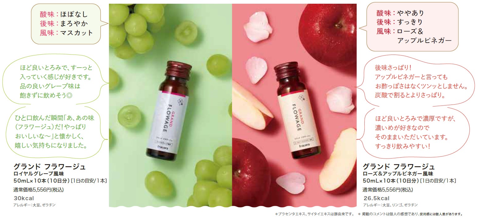 『グランド フラワージュ』は、従来の“フラワージュシリーズ”をパワーアップし、2022年10月に「ローズ&アップルビネガー風味」が誕生。身体本来の美のサイクルをサポートする先端美容成分をたっぷり配合し、多くのお客様より愛飲いただいています。
