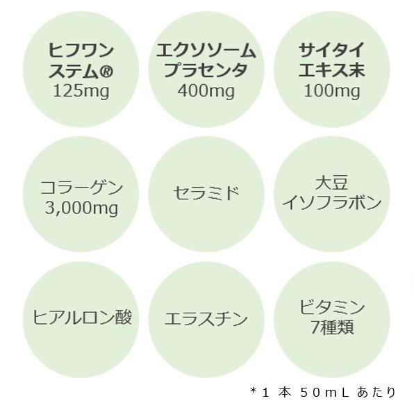 ※1 化粧品マーケティング要覧2023 No.1美容液抗老化2020年~2022年実績(株)富士経済※2 年齢に応じた栄養補給 ※3 豚由来プラセンタエキスに含有されるエクソソーム中のmiRNA 配列の一部を見出したことを世界で初めて特許申請したエクソソームプラセンタを使用