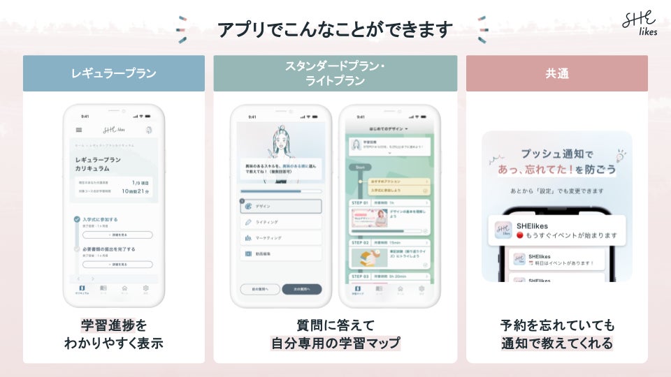 SHE、自分らしい働き方を叶えるため受講生の学習習慣の定着に伴走する「SHElikesアプリ」をリリース