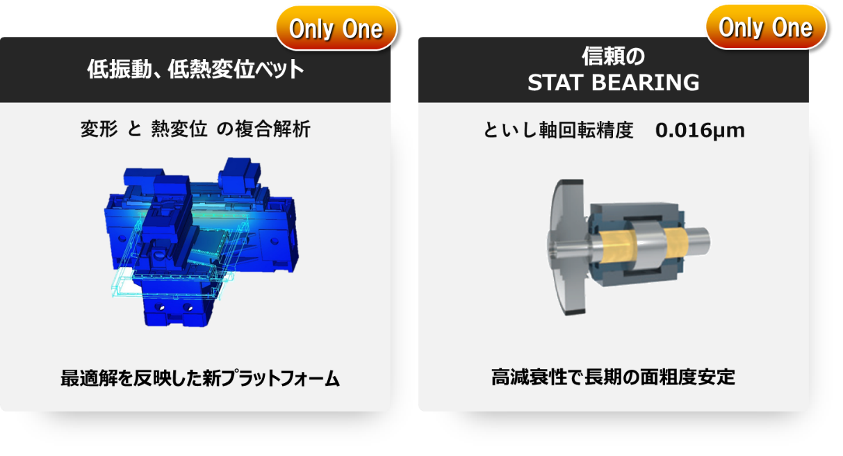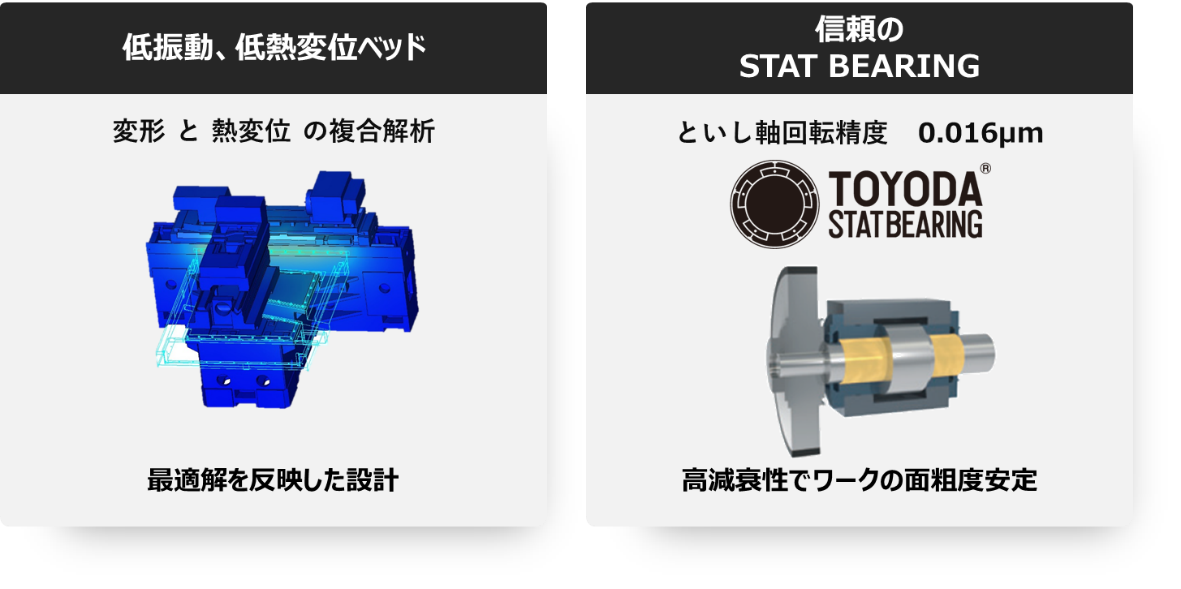 「変形」「熱変位」「振動」といった抑え込むべき3要素を極限まで低減します。ベッドは「変形」と「熱変位」の複合解析で機械構造の最適解を反映した設計を行いました。また、といし軸回転精度0.016μmで低振動の「STAT BEARING」を搭載することで高剛性と低熱変位の最適構造を実現。寸法変化従来比30%低減を達成しました。