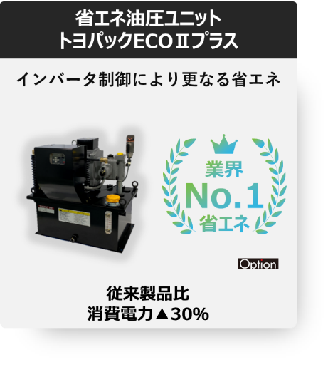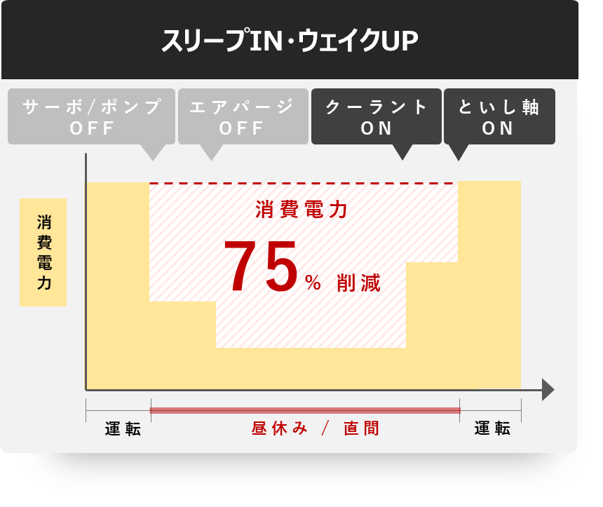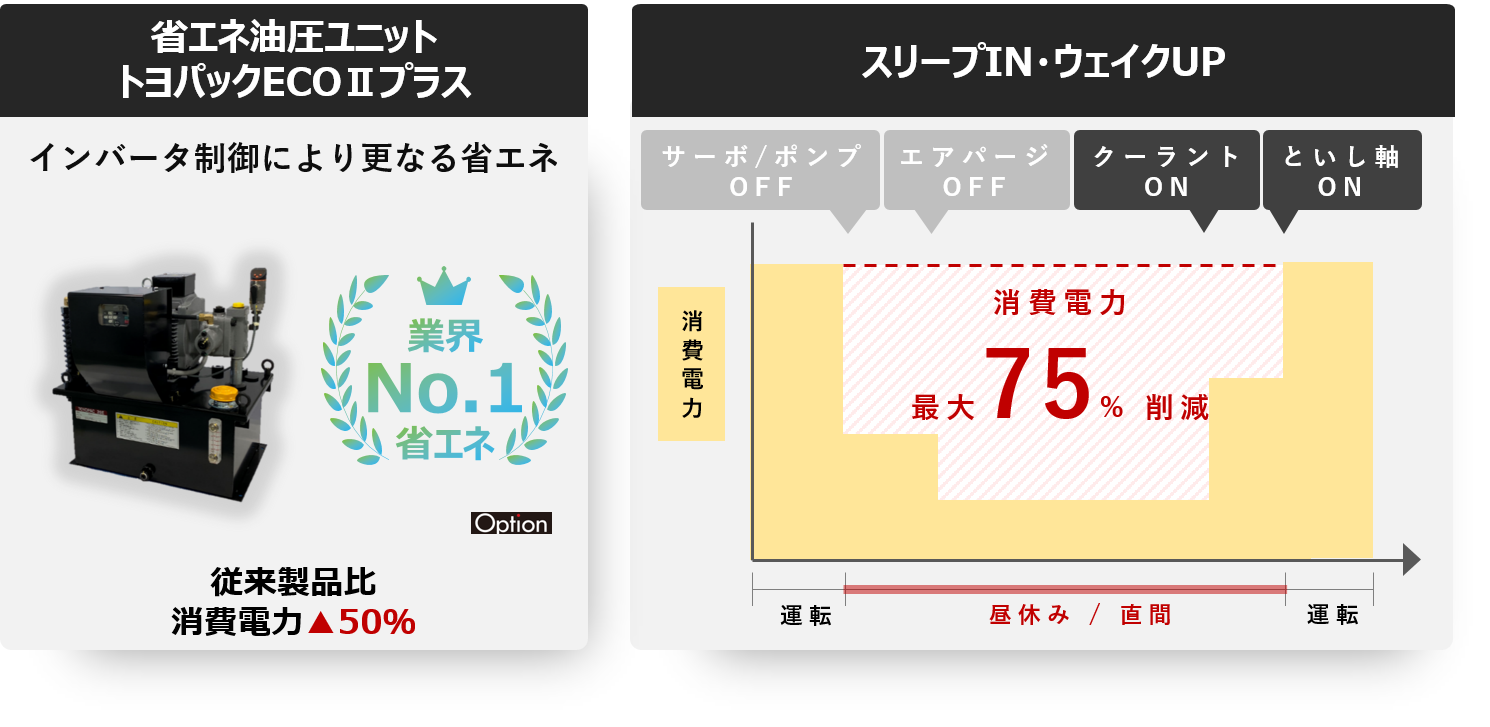 スリープIN・ウェイクUP機能により、非加工時間の消費電力を最大75%削減します。また、ジェイテクトフルードパワーシステム製の省エネ油圧ユニット「トヨパックECOⅡプラス」は、インバータ制御により消費電力従来比50%削減を達成しました。これらの消費電力削減効果により、CO2排出量を3t/年削減します。